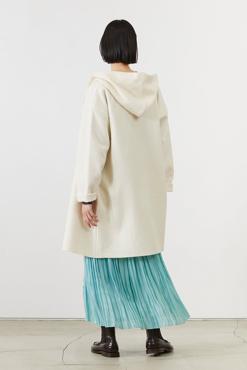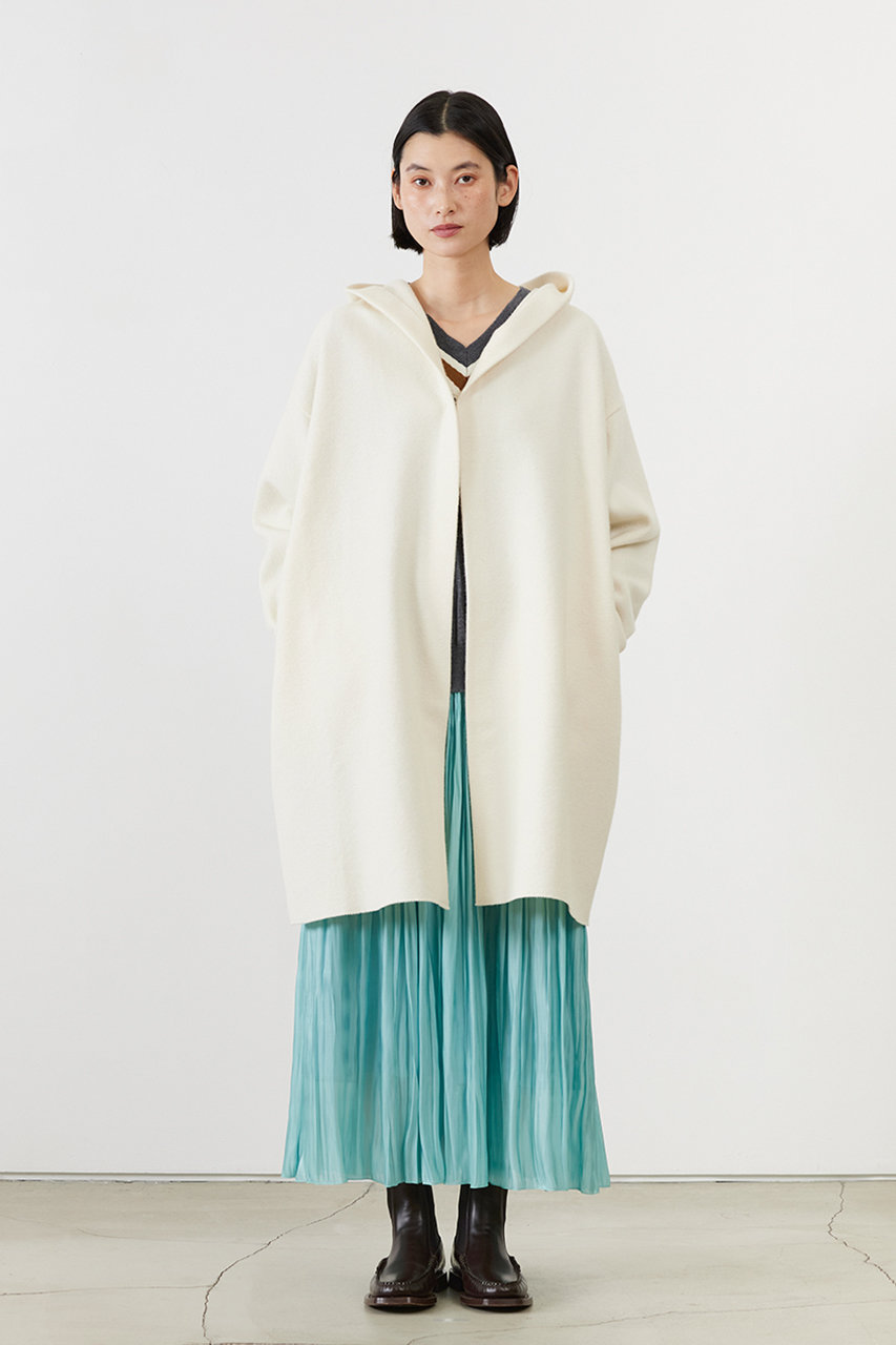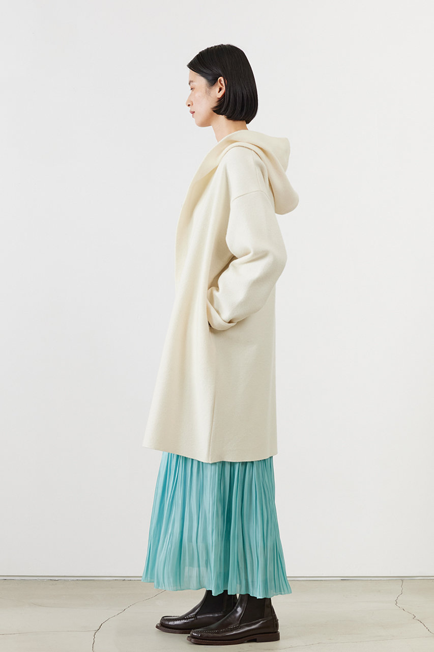程よい肉厚で、早い時期から気軽に羽織れる便利なカーディガン。ウールシルクの糸に膨らみを持たせる加工を施し、エアリーでライトなオリジナル編地を生み出す1着。ニットでありながら、布帛のように伸縮性のない編地が特徴で、気負わず着用できる。フード付きながらも軽さを感じられるデザインで、中間アウターとしてもヘビロテ必須。