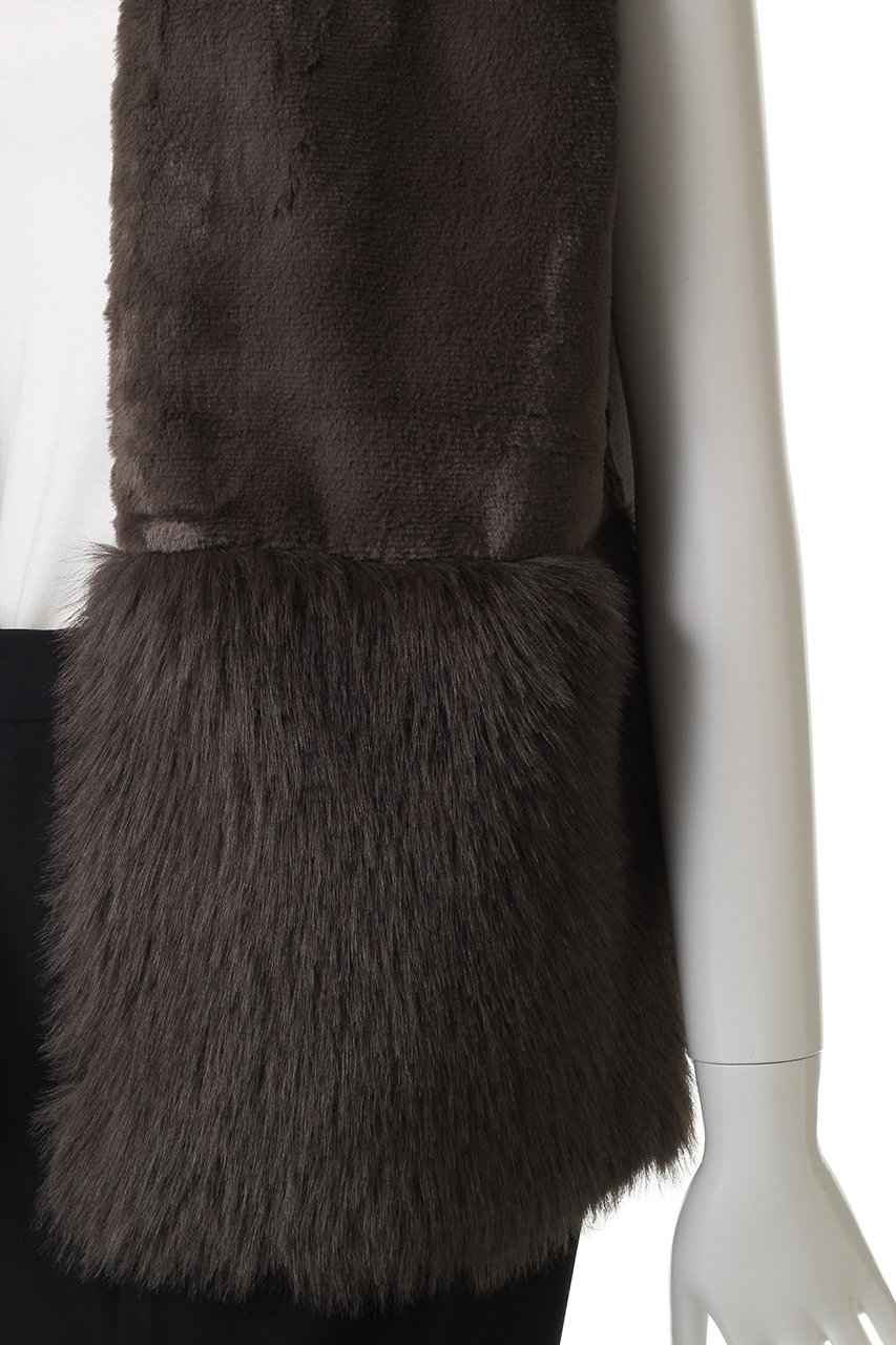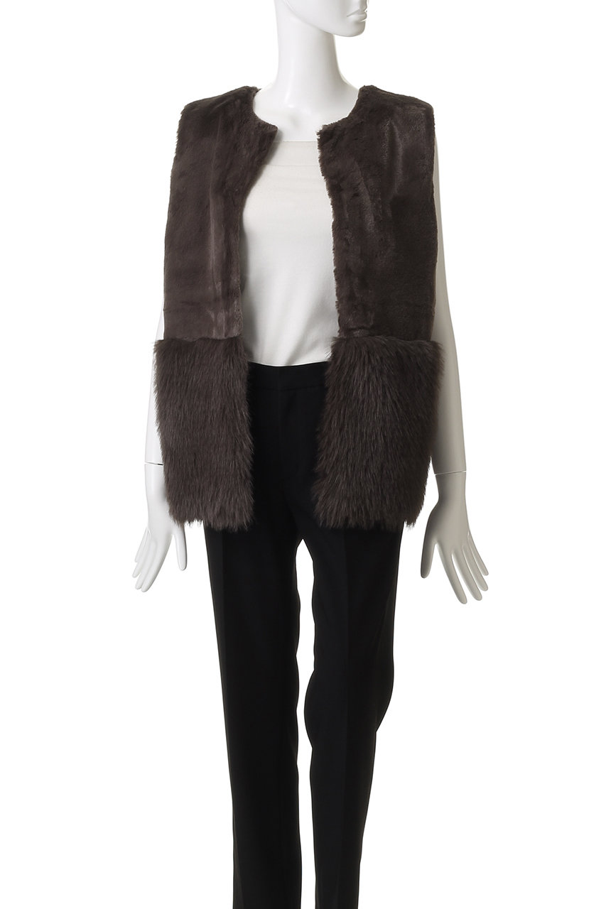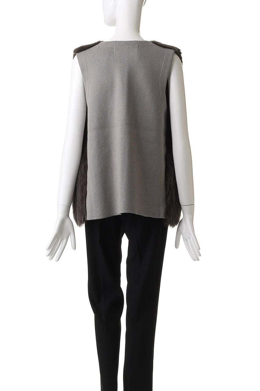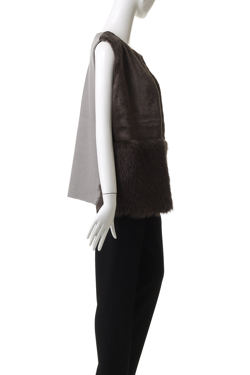表情の異なる2種類のファーを前身頃に、後身頃にはニットを使用したモダンなベスト。ファーの華やかさと、伸縮性のあるニットの快適な着用感を両立したデザインが大人心を鷲掴み。バランスよく着こなせるミドルレングスで、程よい肉厚感でコートインでも活躍しそう。フロントオープン仕様のため、さまざまなスタイリングに合わせやすいのが魅力。