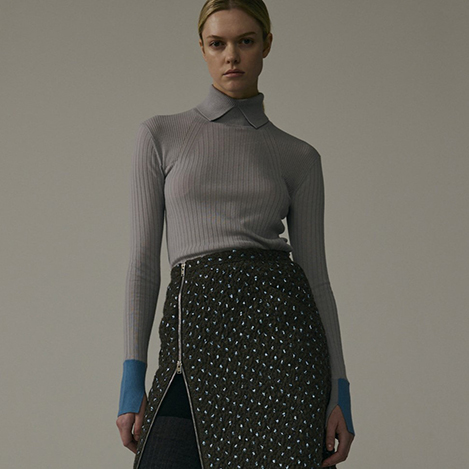 袖口にブルーを配色し、シンプルでありながら存在感を出してくれる1着。最高級メリノウール15.5マイクロンを使用した糸で、紡績段階で糸に毛羽立ちを少なくするよう、コンパクトマシンで作られており、上質さを感じる光沢感があります。こちらも毛玉ができにくいのが嬉しい。襟付きタートルネックとクルーネックの2パターン展開中。