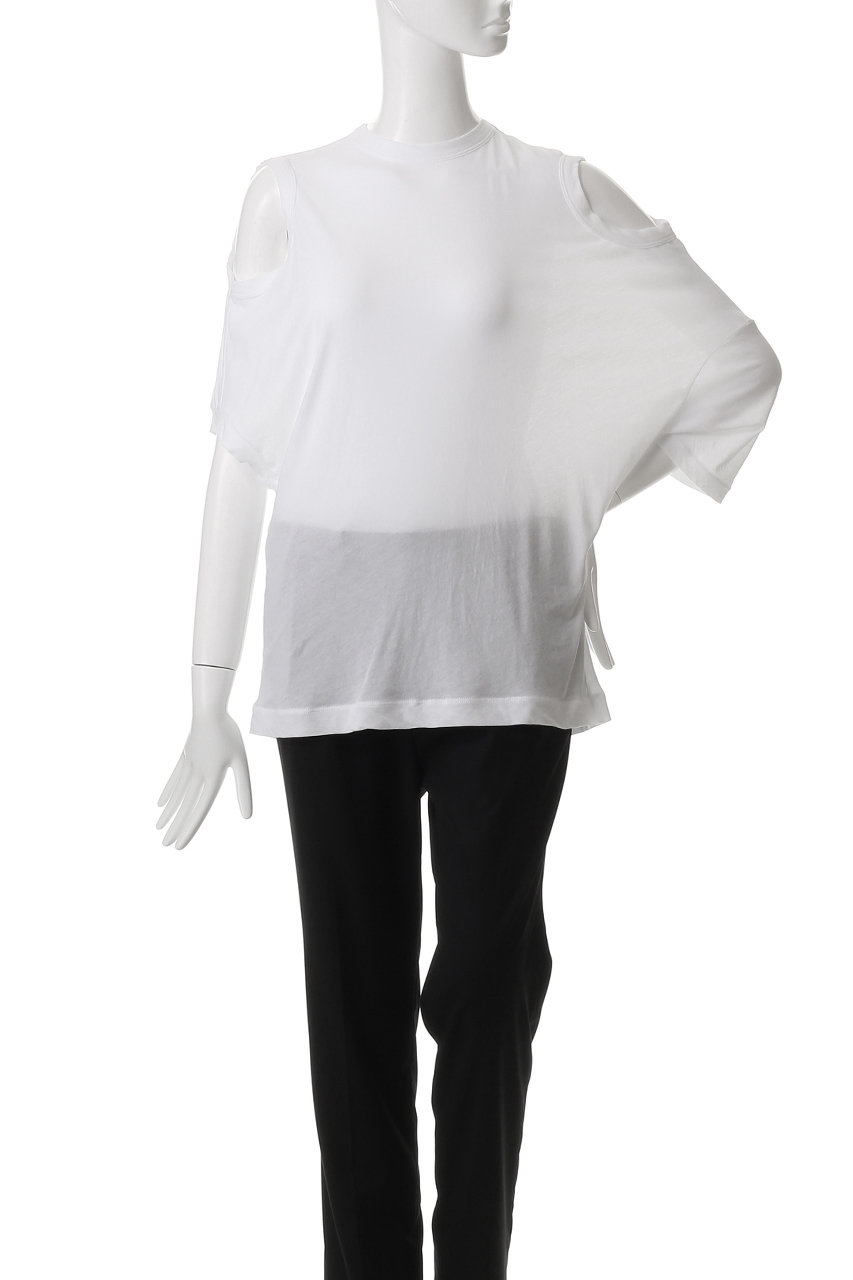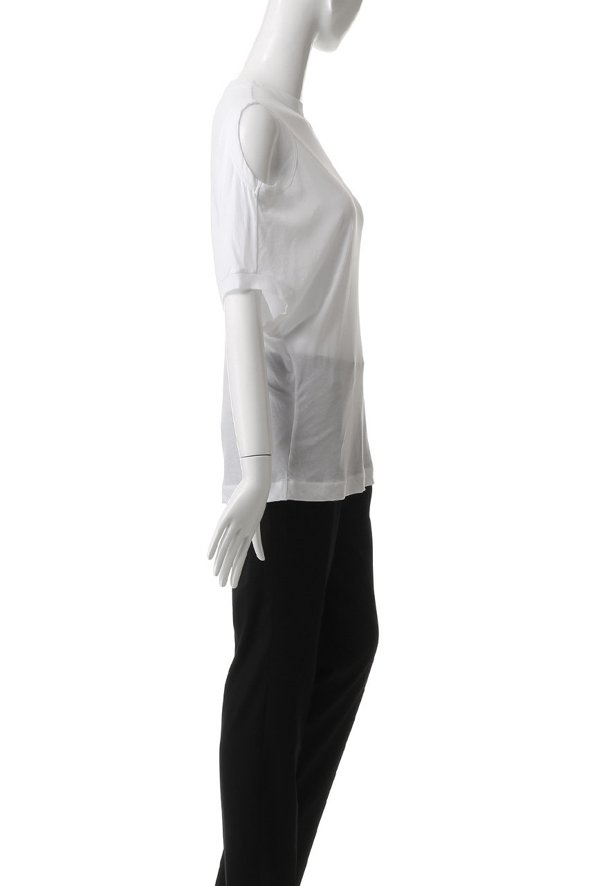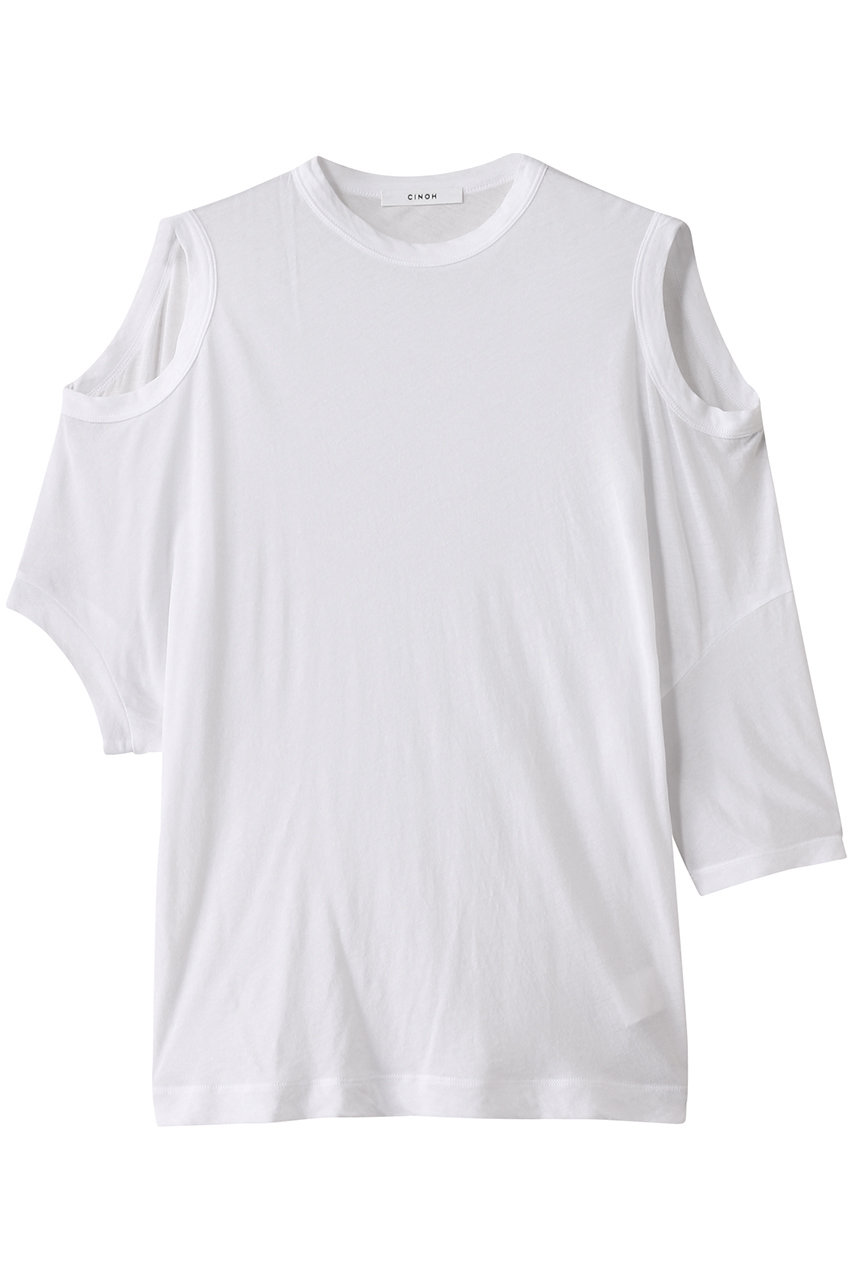 微光沢とシャリ感が魅力の強撚コットン天竺を使用。ドレープ性に優れた上品な風合いと、なめらかな肌触りが特徴。インド産の超長綿を原料に、真夏でも快適な吸水速乾性をキープ。オープンショルダーがヘルシーな抜け感を演出します。
