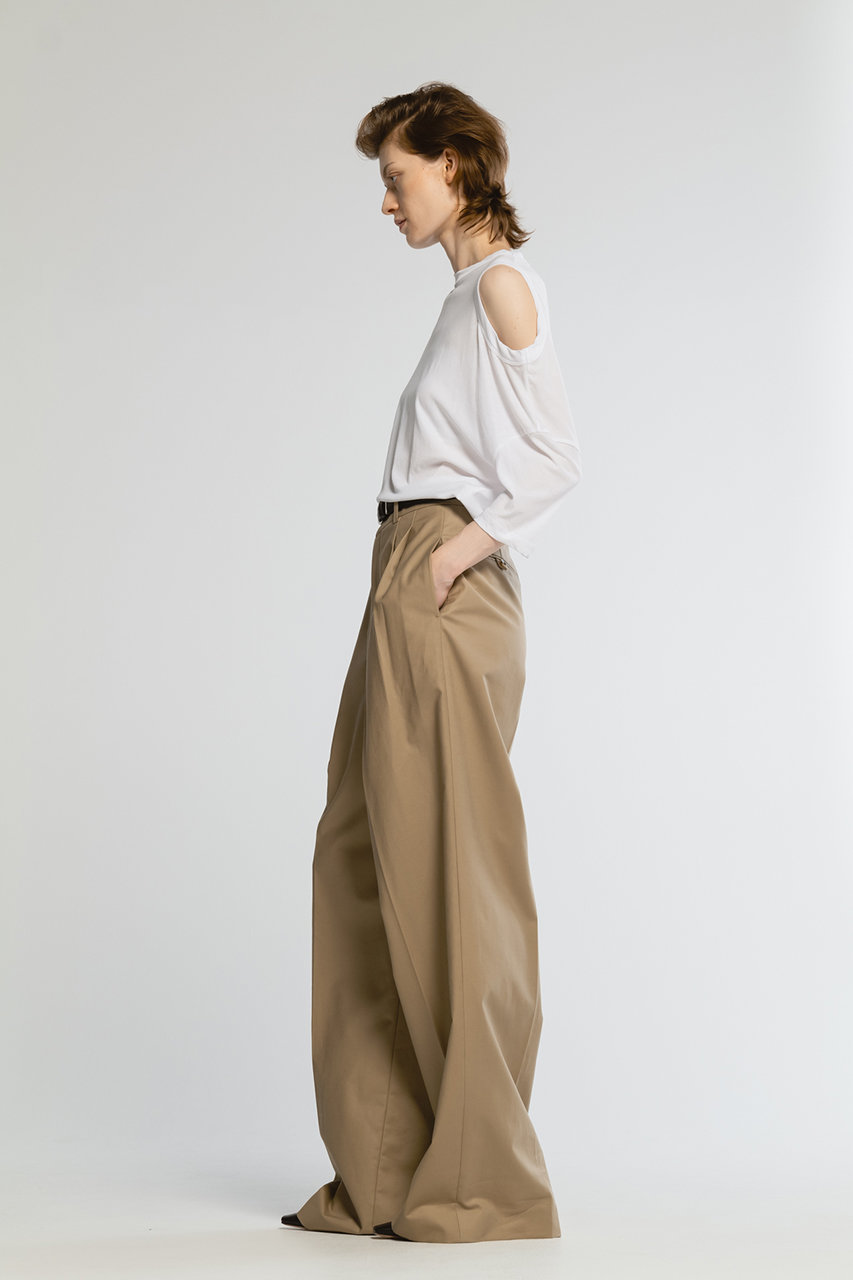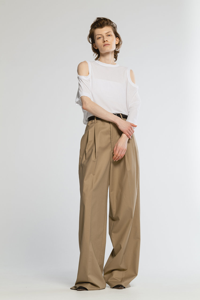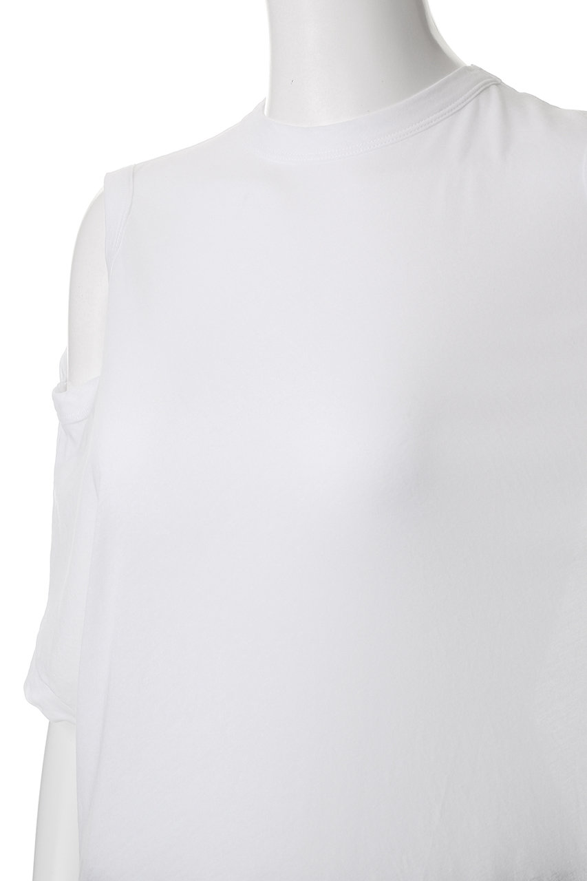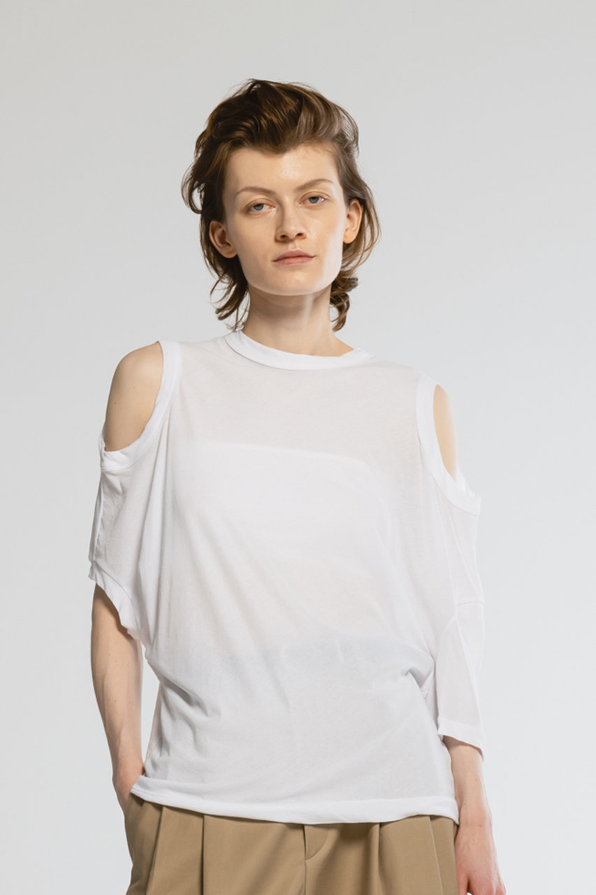 微光沢とシャリ感が魅力の強撚コットン天竺を使用。ドレープ性に優れた上品な風合いと、なめらかな肌触りが特徴。インド産の超長綿を原料に、真夏でも快適な吸水速乾性をキープ。オープンショルダーがヘルシーな抜け感を演出します。