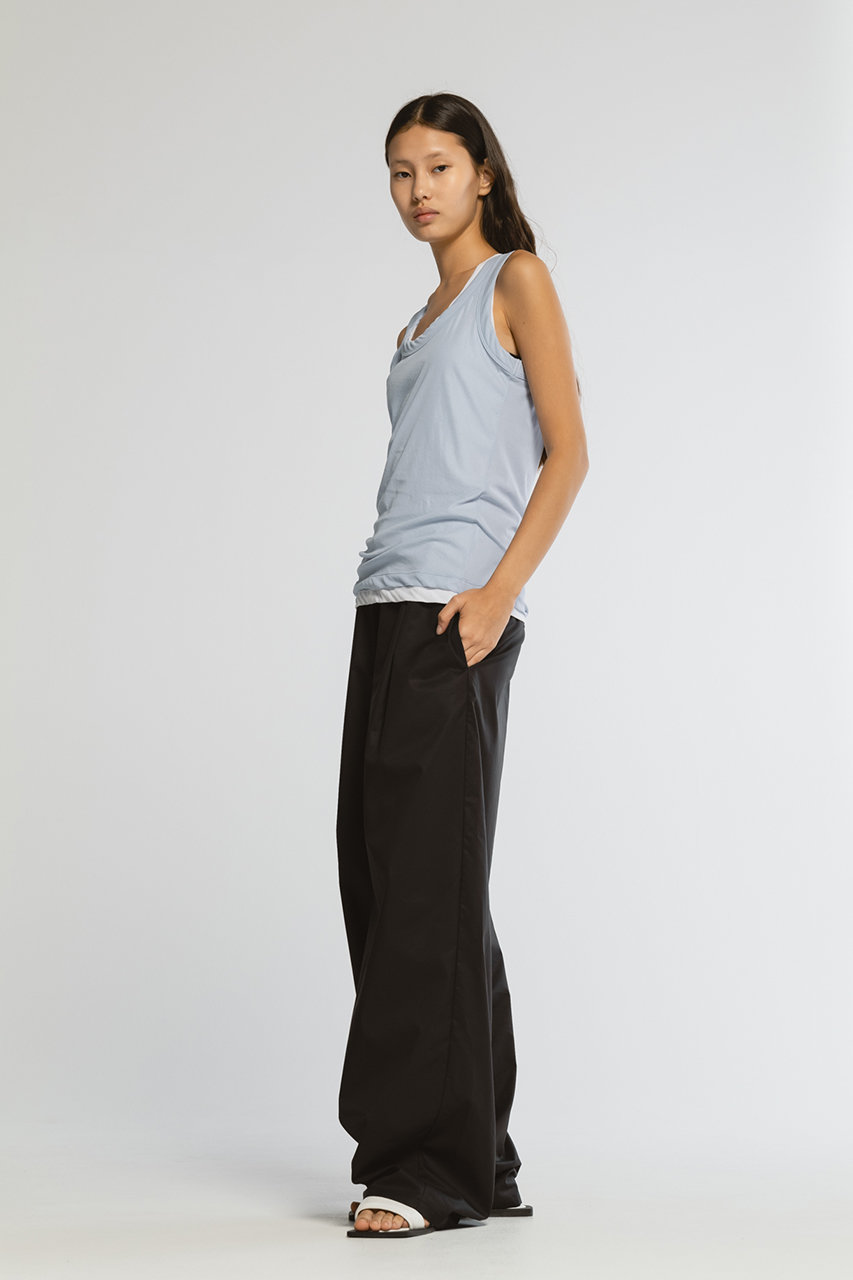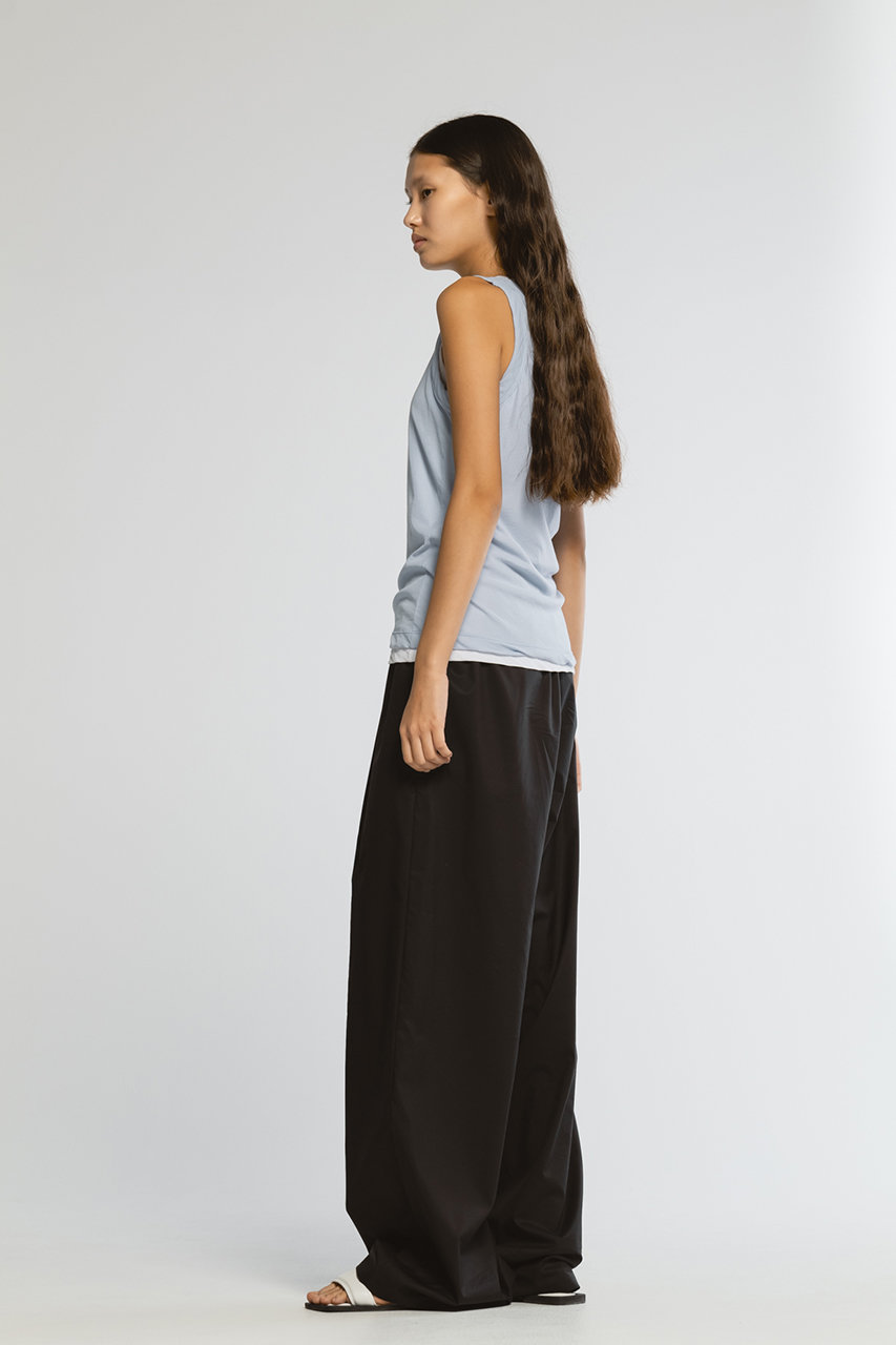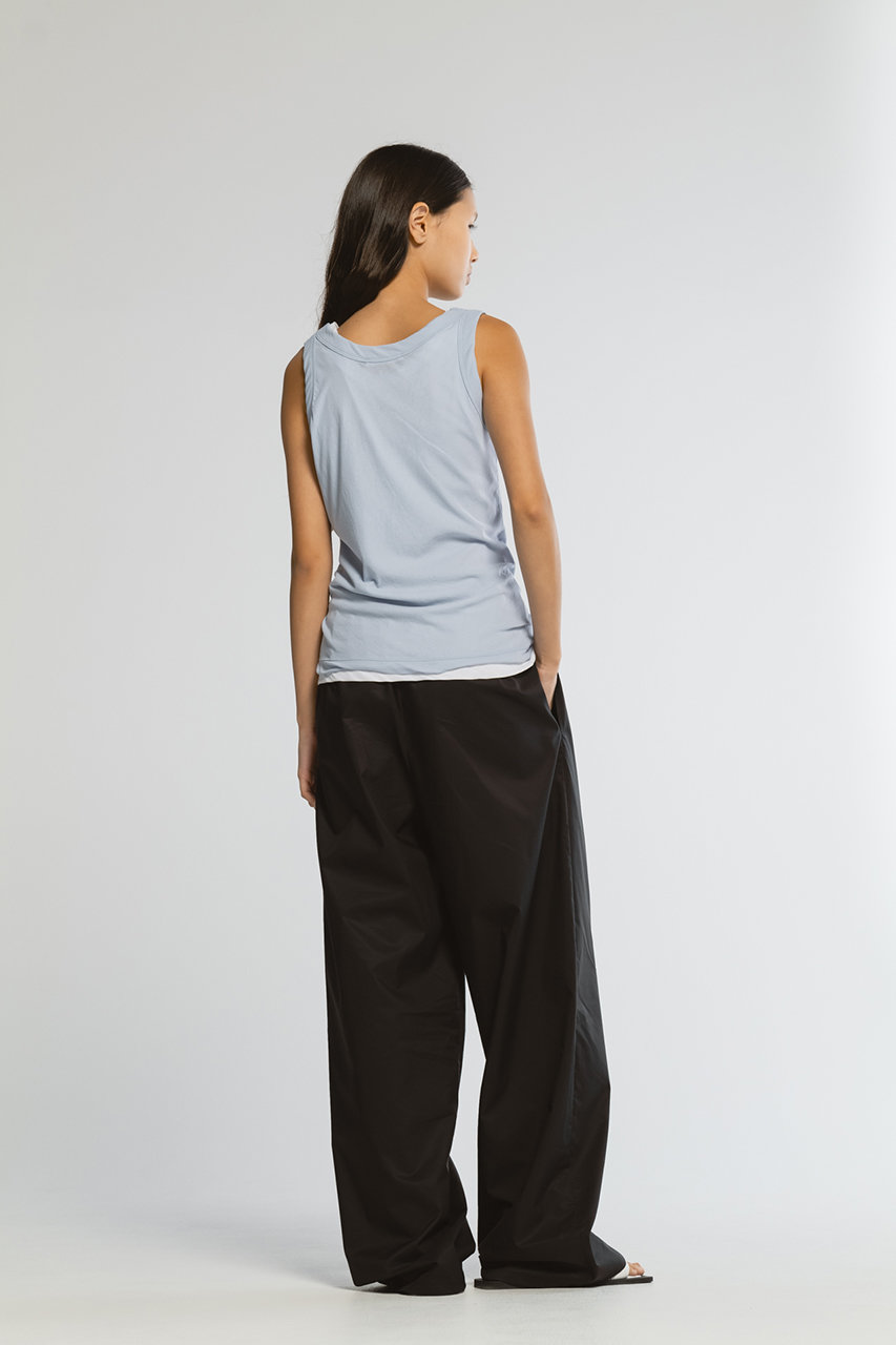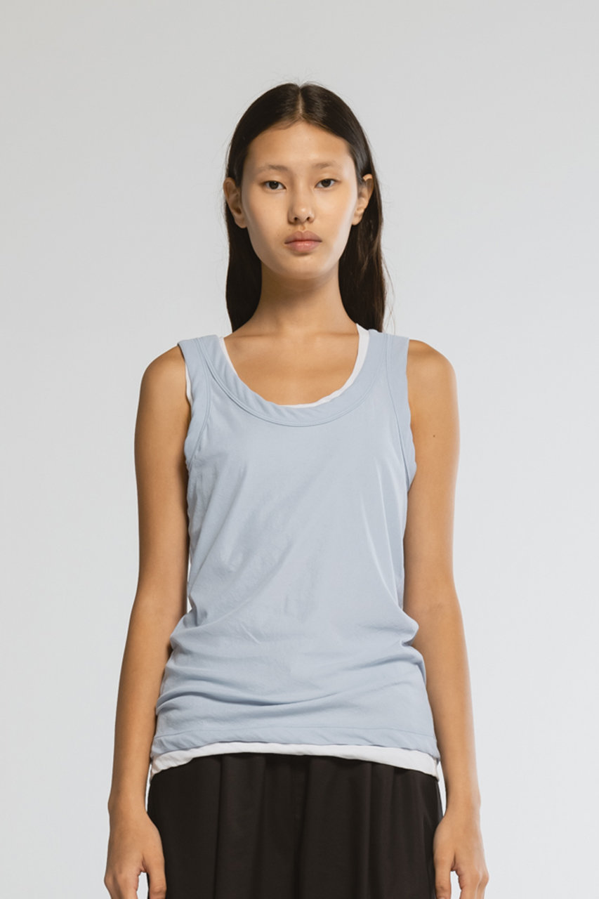 華奢な素材感に、襟ぐりとアームホールの絶妙なバインダー幅が映えるタンクトップ。上質な強撚コットン天竺ならではの微光沢とシャリ感、ドレープのある美しいシルエットが魅力。