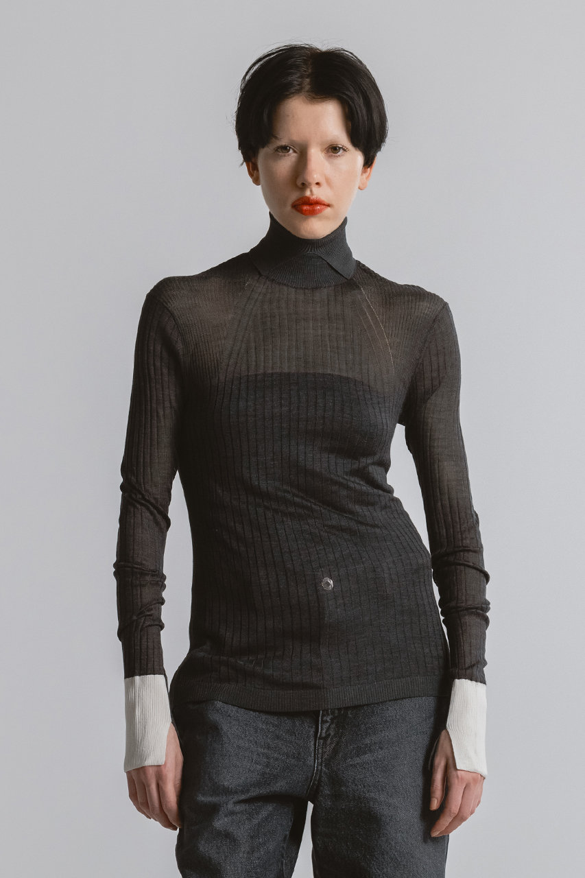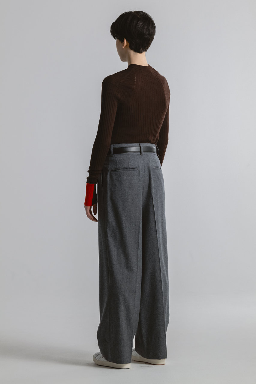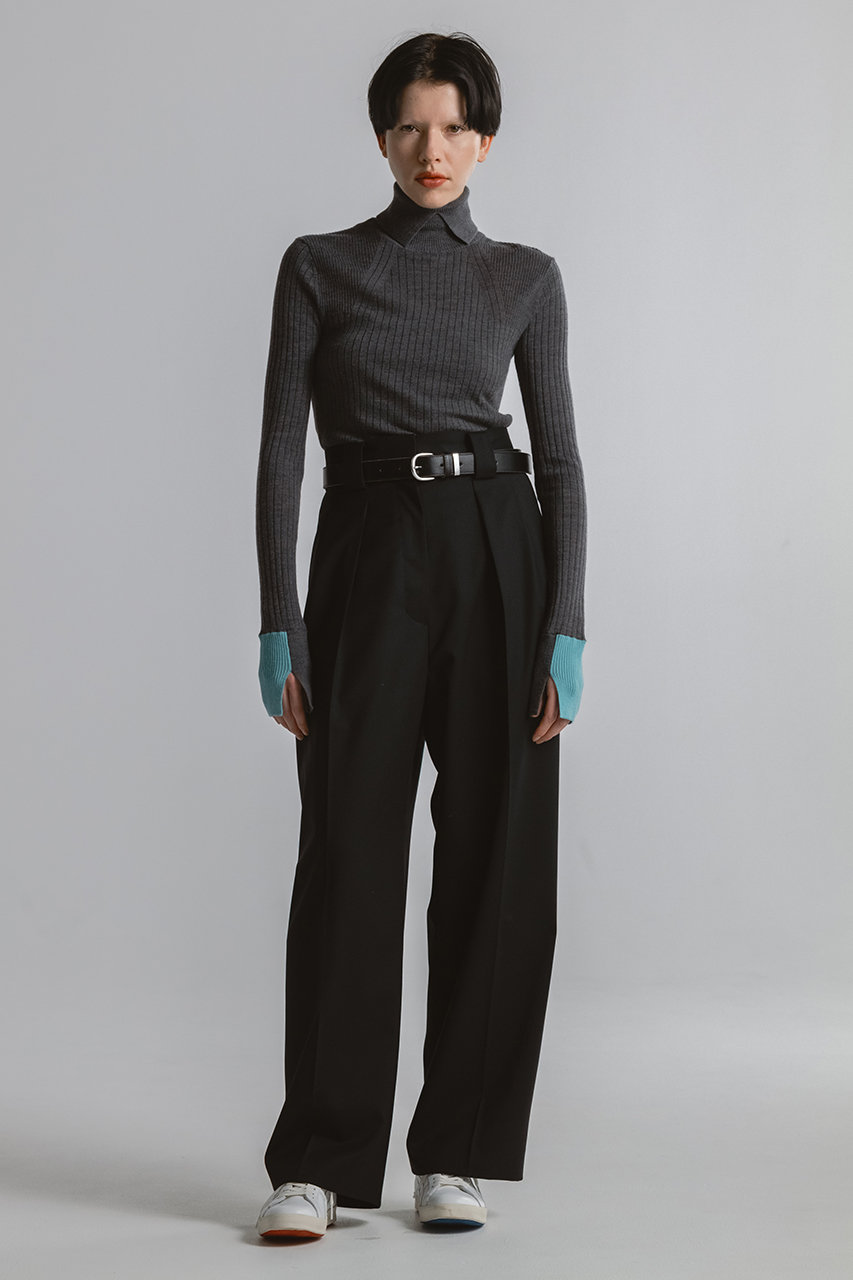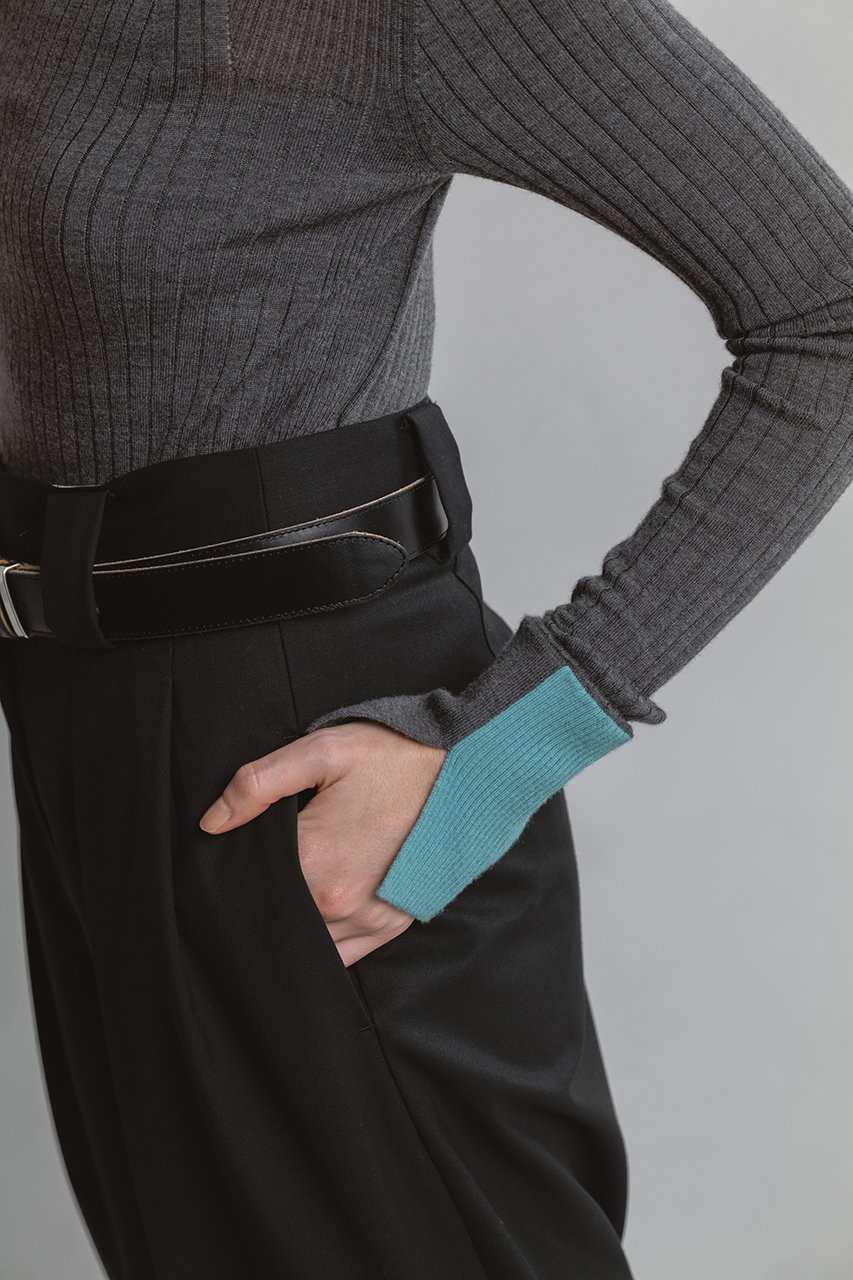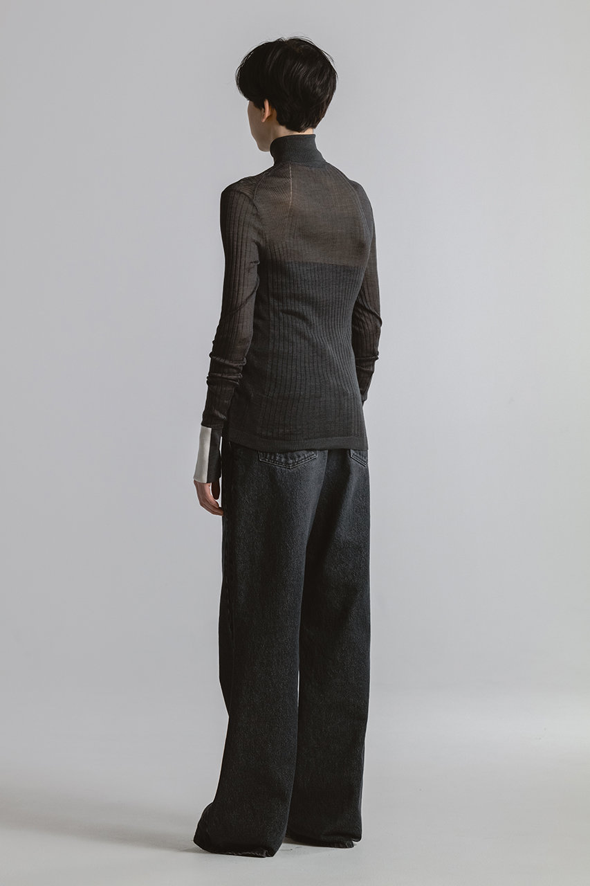 タートルネック部分が襟のようなディテール。イタリアの老舗ブランド、ロロピアーナによる最高級メリノウールを使用。カシミヤのようななめらかな肌触りと、美しい光沢感で大人のワードローブにふさわしいアイテムとなっています。毛羽立ちを抑える特殊な紡績技術により、いつまでも上品な風合いを保ちます。