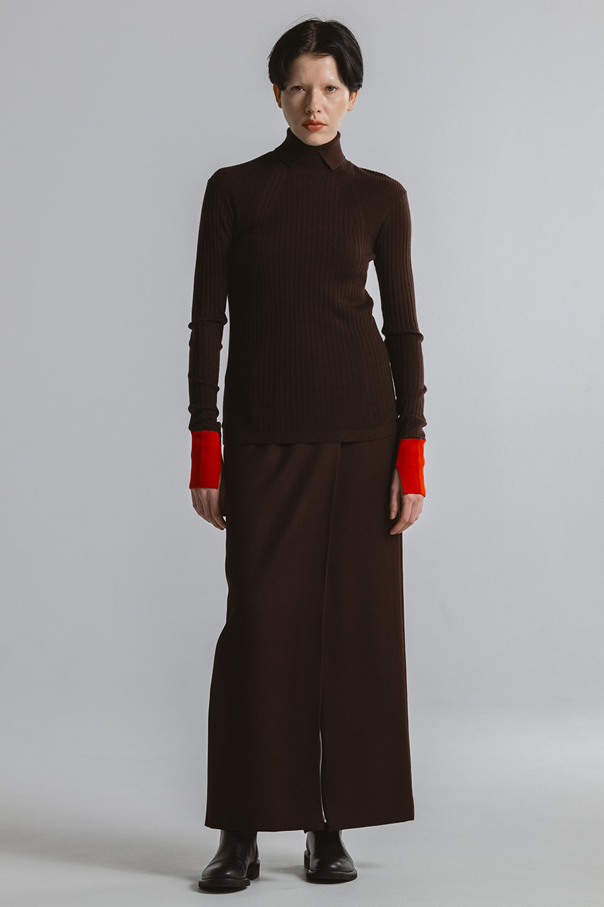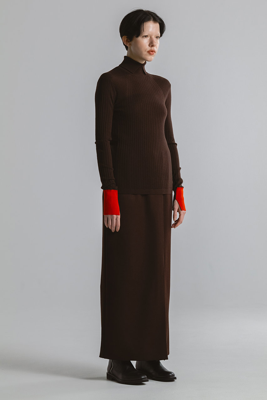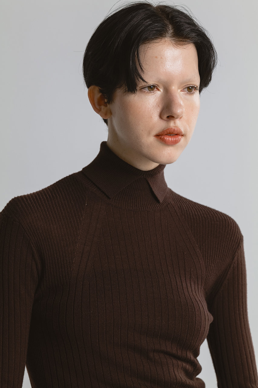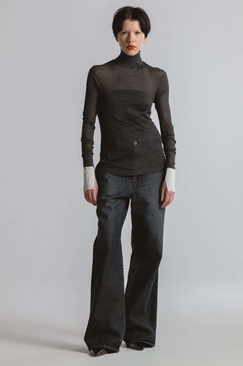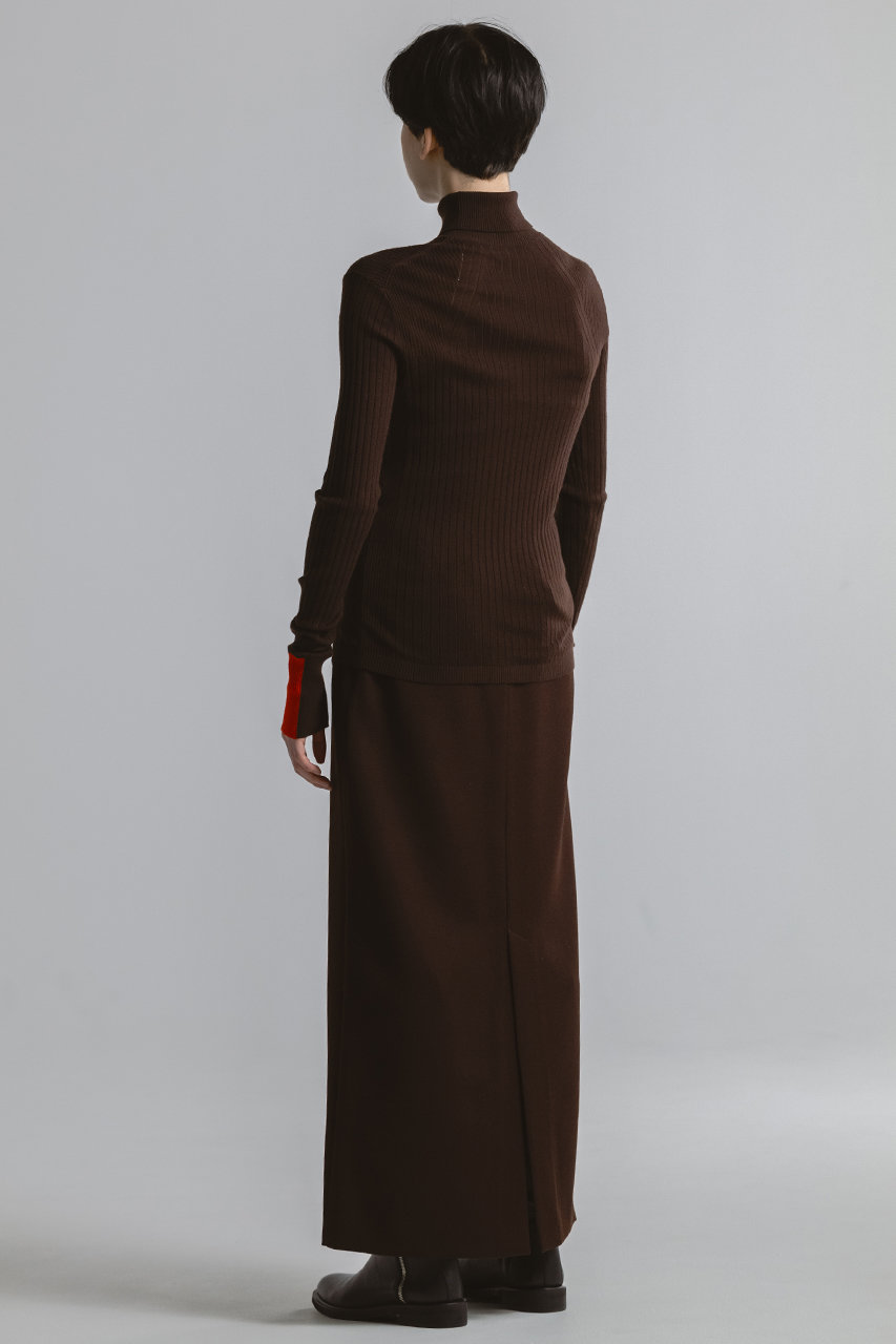タートルネック部分が襟のようなディテール。イタリアの老舗ブランド、ロロピアーナによる最高級メリノウールを使用。カシミヤのようななめらかな肌触りと、美しい光沢感で大人のワードローブにふさわしいアイテムとなっています。毛羽立ちを抑える特殊な紡績技術により、いつまでも上品な風合いを保ちます。
