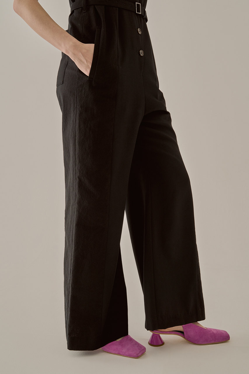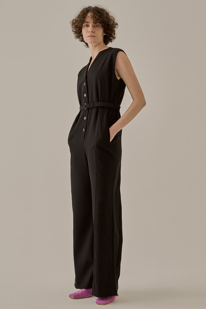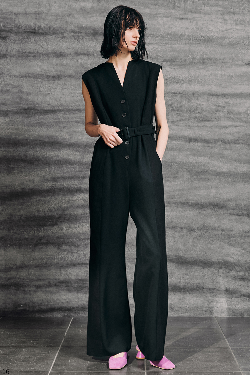 普段のワードローブに上質さと個性を加えたい方にぴったりのコンビネゾン。シャープなVネックと構築的なシルエットバランスが、洗練されたモード感を引き立てる。ウエストはベルトを添えてメリハリをつけても素敵。1枚でサマになるからこそ、アクセサリーやシューズ次第で表情を変える楽しみもあり。