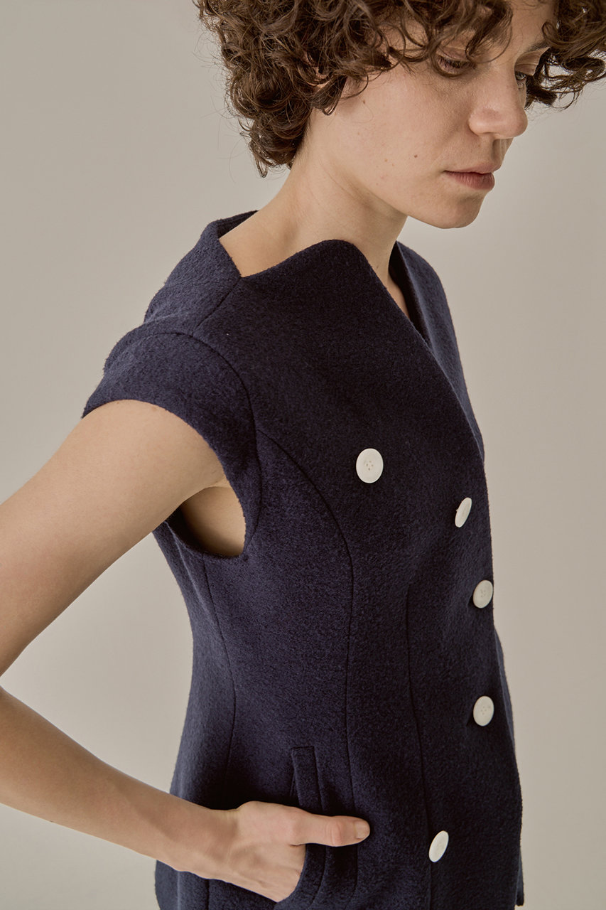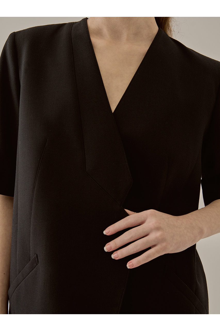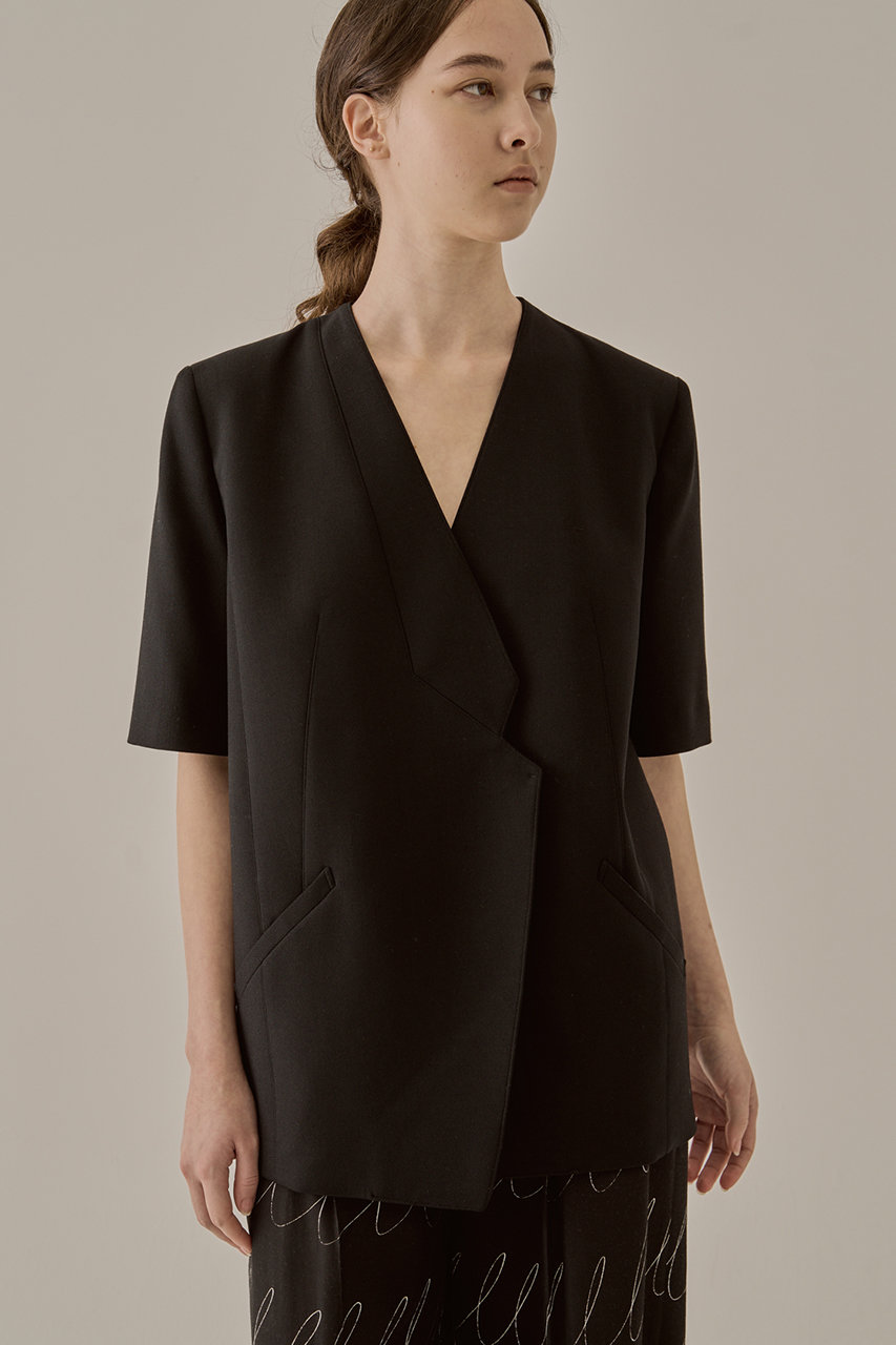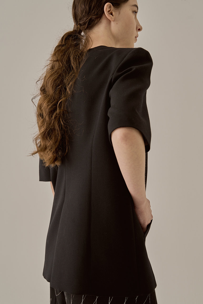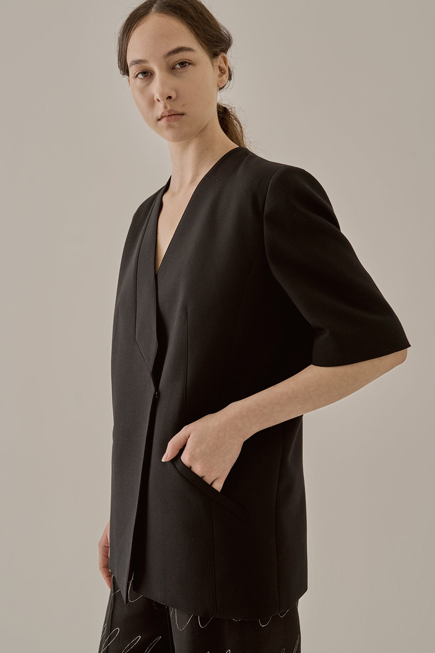構築的なシルエットが大人モードな魅力を醸し出すハーフスリーブジャケット。シャープなVネックラインと洗練されたデザインが、羽織るだけで大人のスタイリングを格上げ。パンツスタイルでクールに、スカートと合わせてエレガントにと、オフィスから会食、カジュアルな外出まで、あなたらしく着まわして。