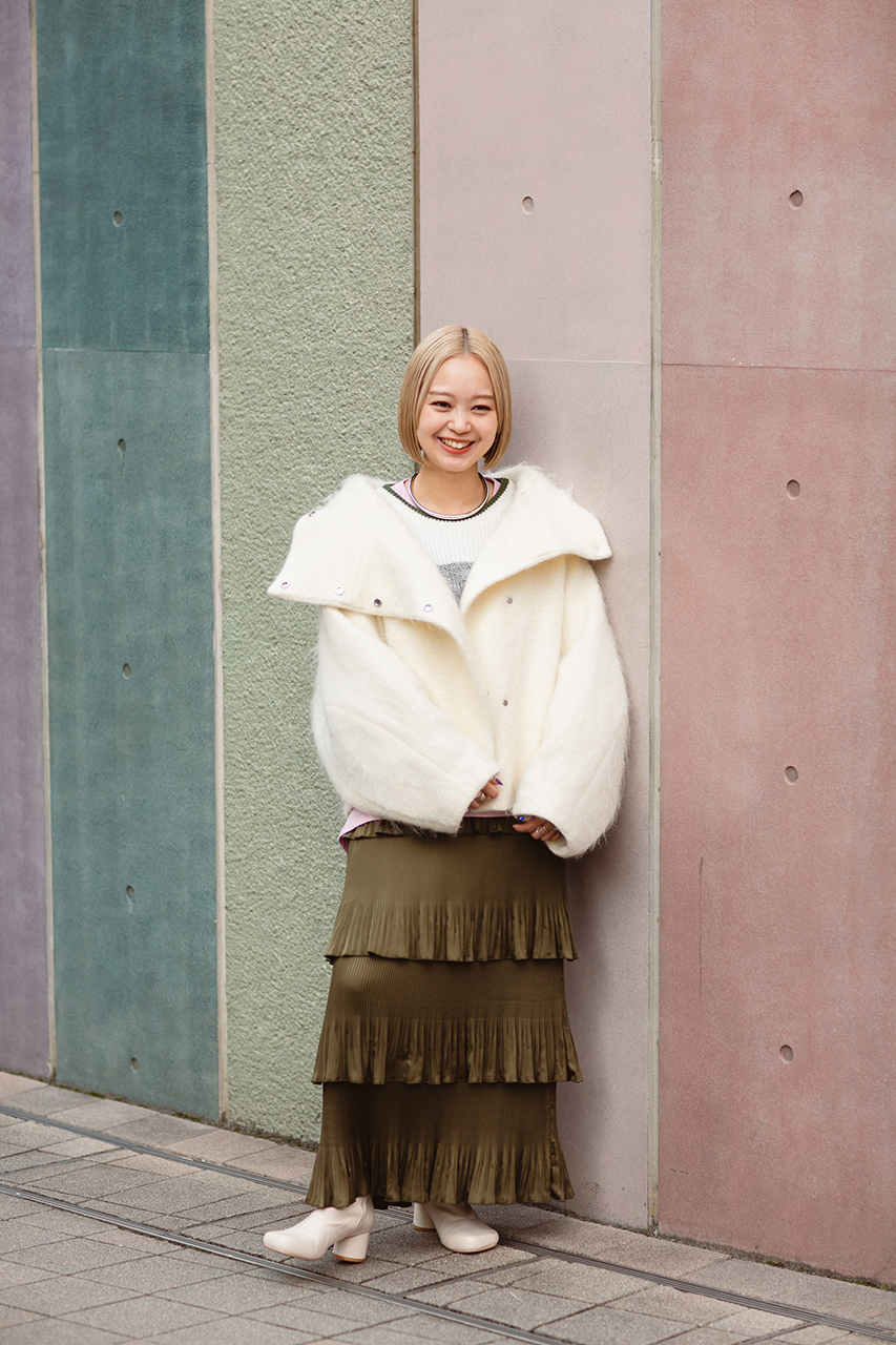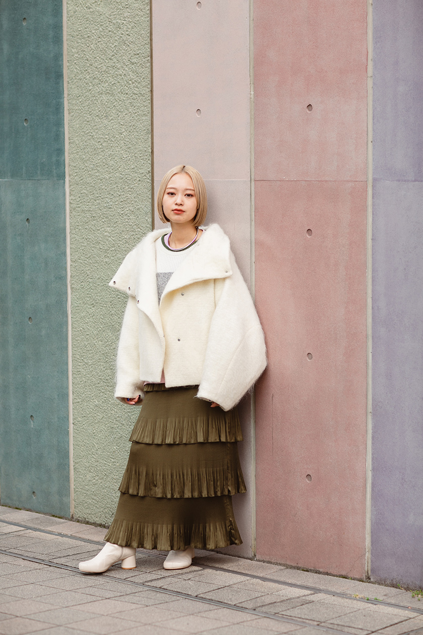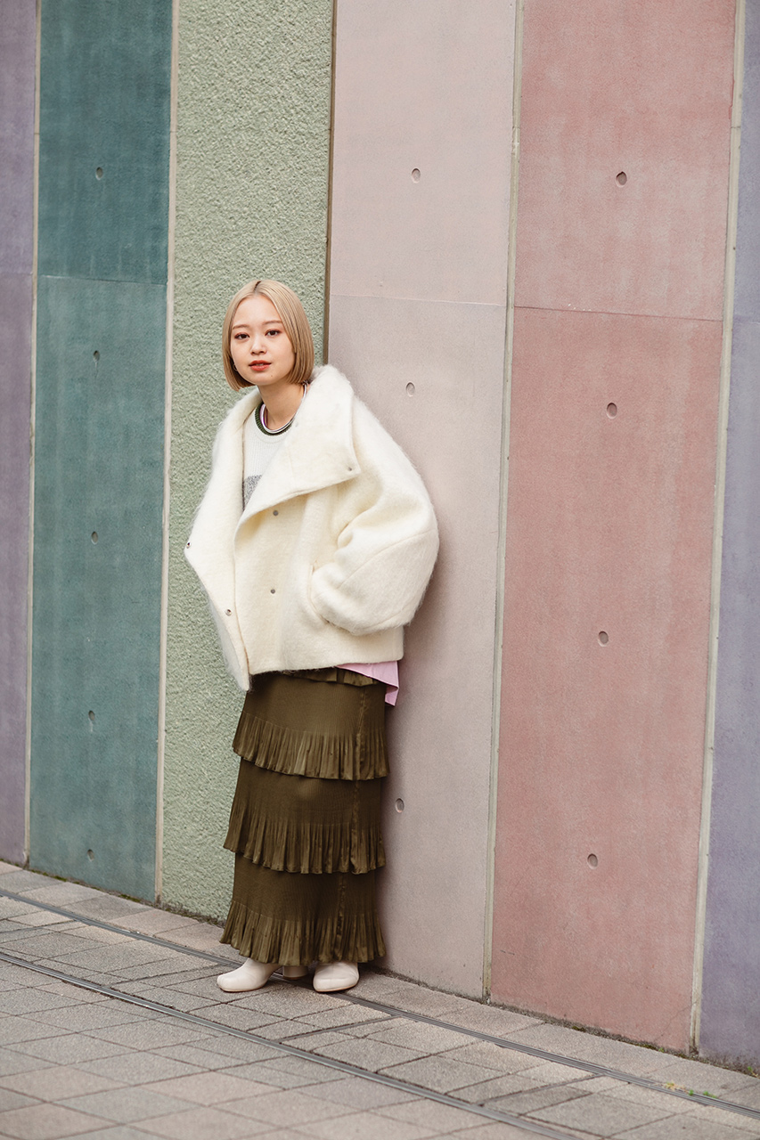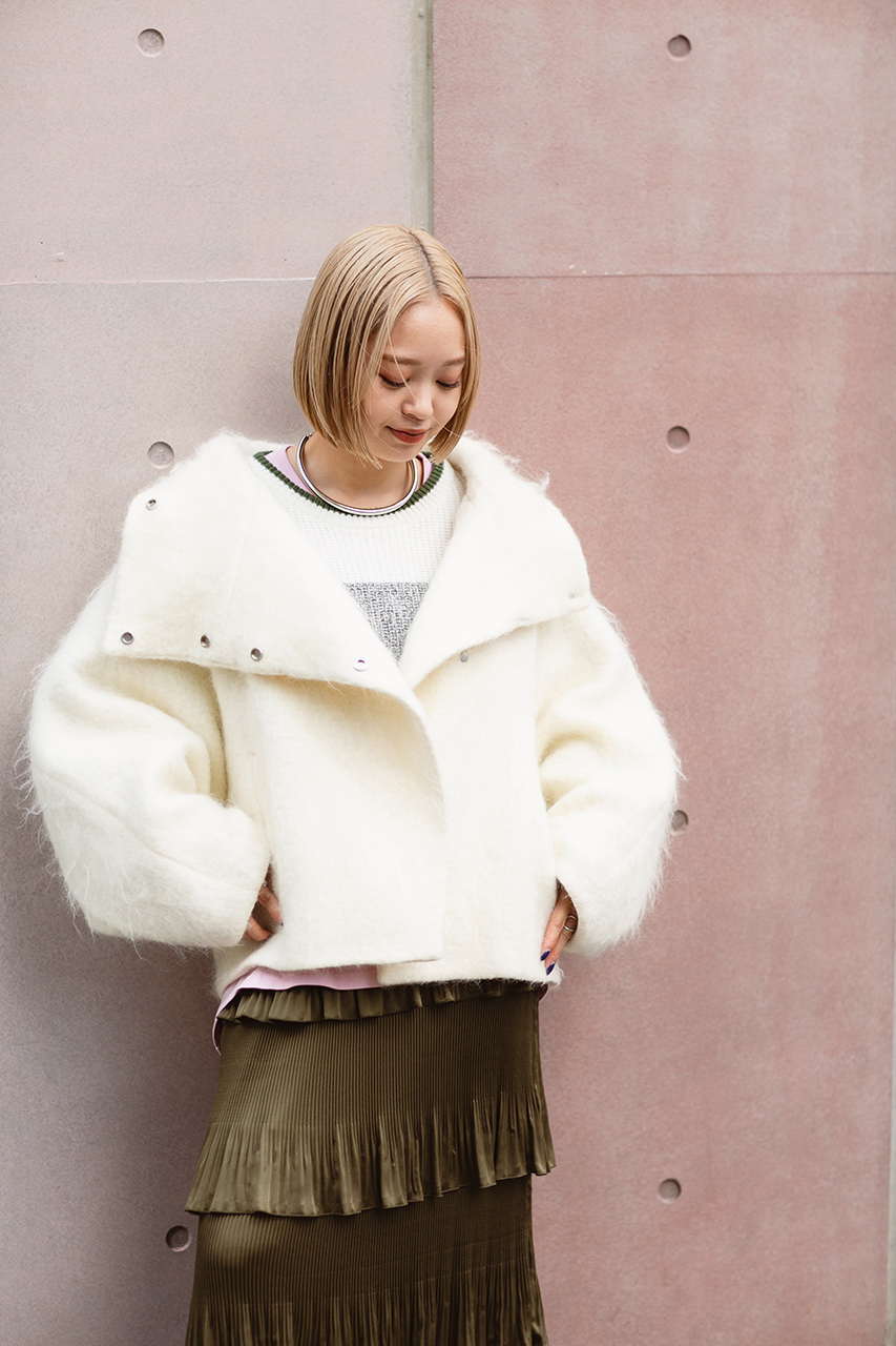 短めのどんなコーデにも合うコートが欲しい! そんな願いを叶えるアウターです。ふわふわした生地がコーデをより冬らしく演出してくれます。