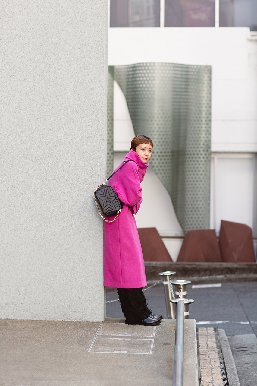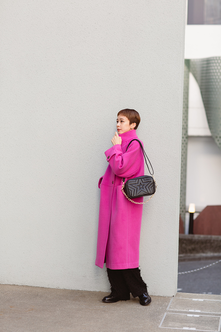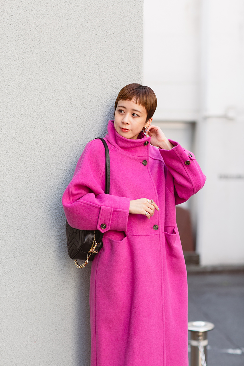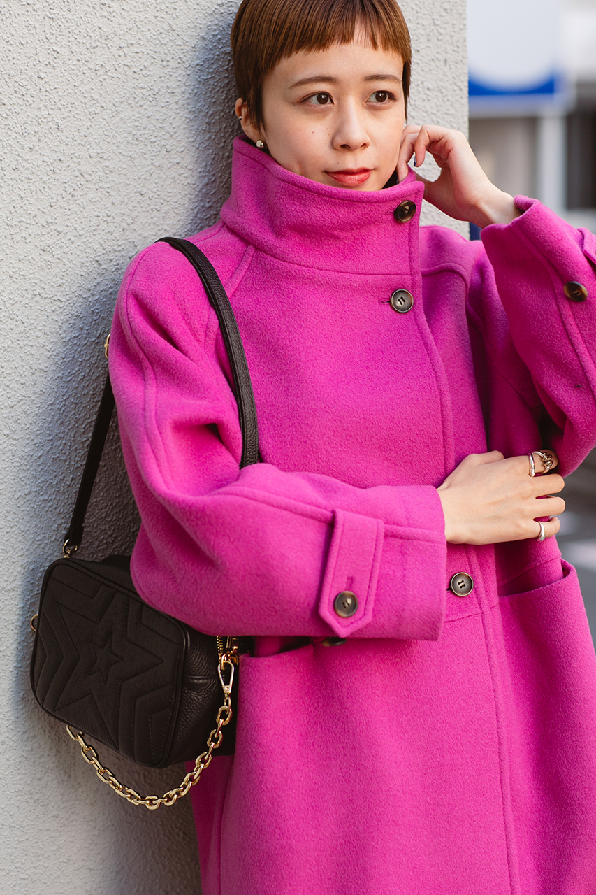 ラブリーなカラーだけどスタンドカラーでかっこよく着こなせます!
