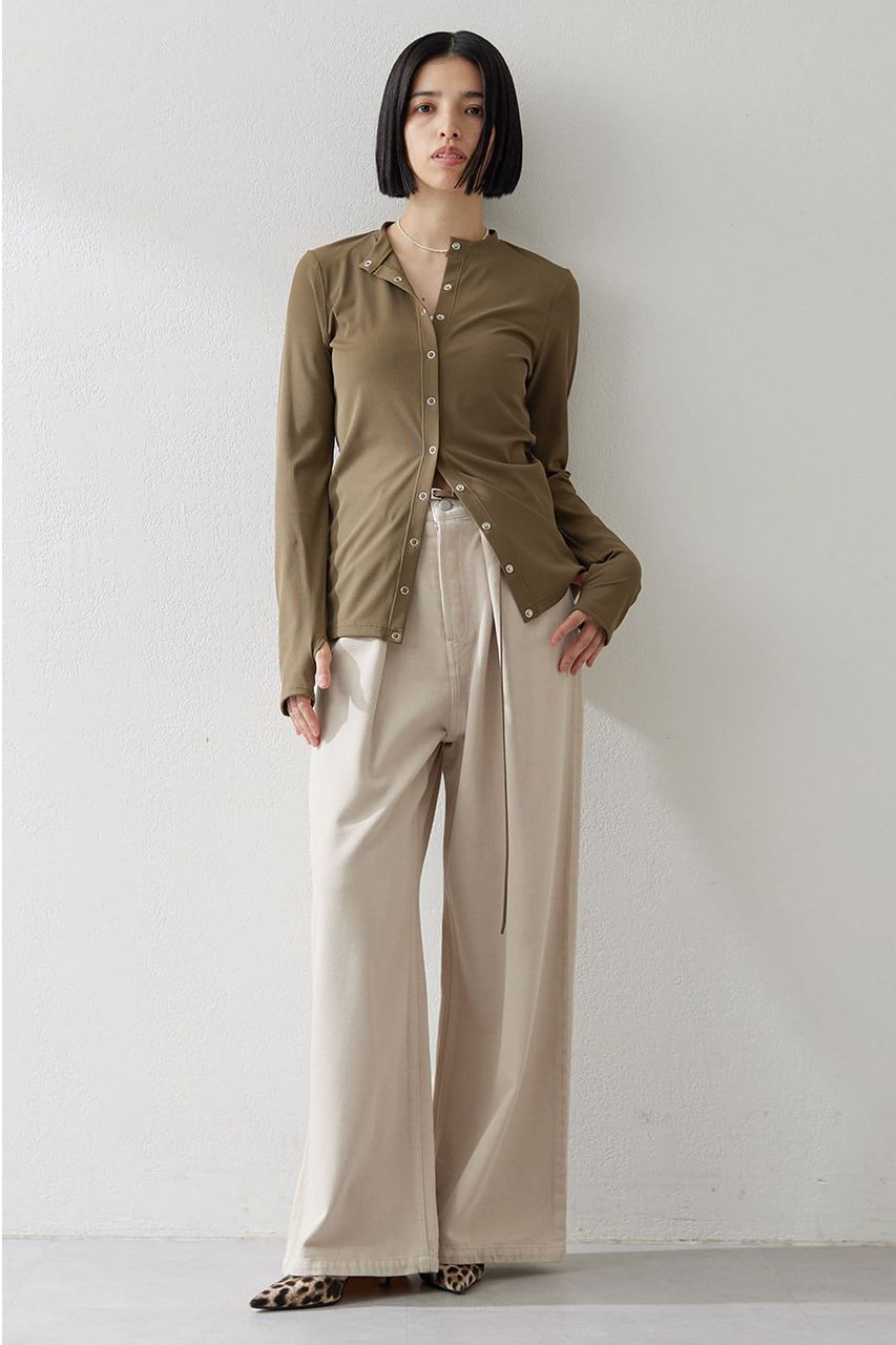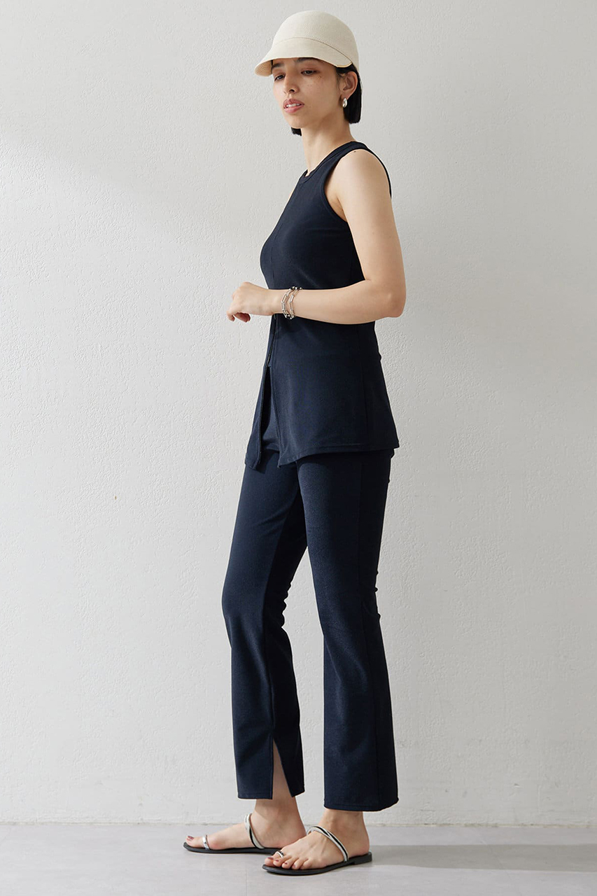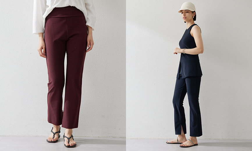 すっきりとしたパンツは裾に向けてやや広がるデザインで脚長効果◎