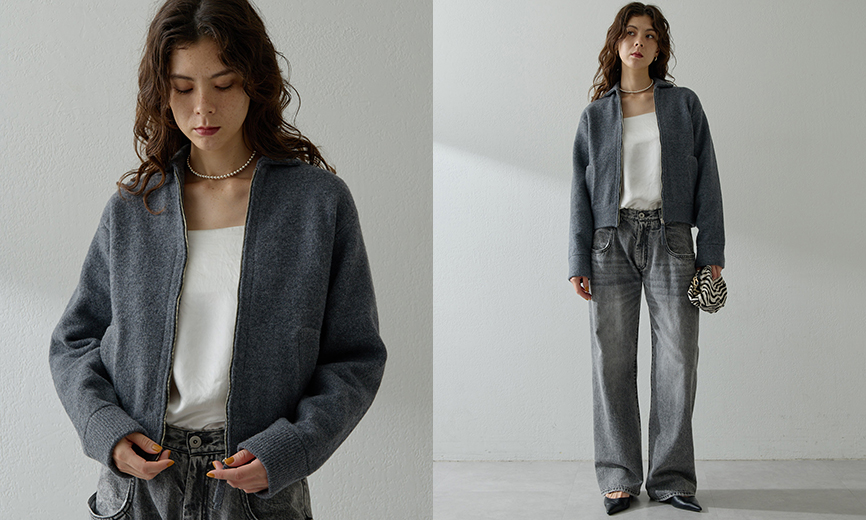 暖かみのあるニット素材で仕立てたジップアップブルゾン