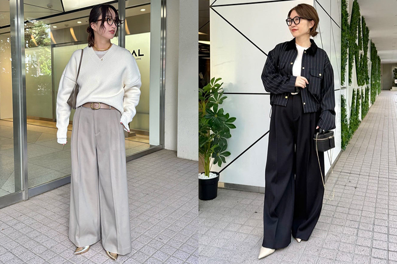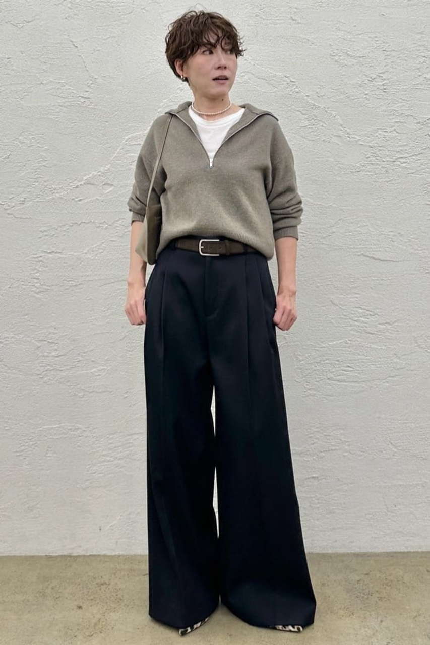きれいなフォルムを演出する、上品なワイドタックパンツ