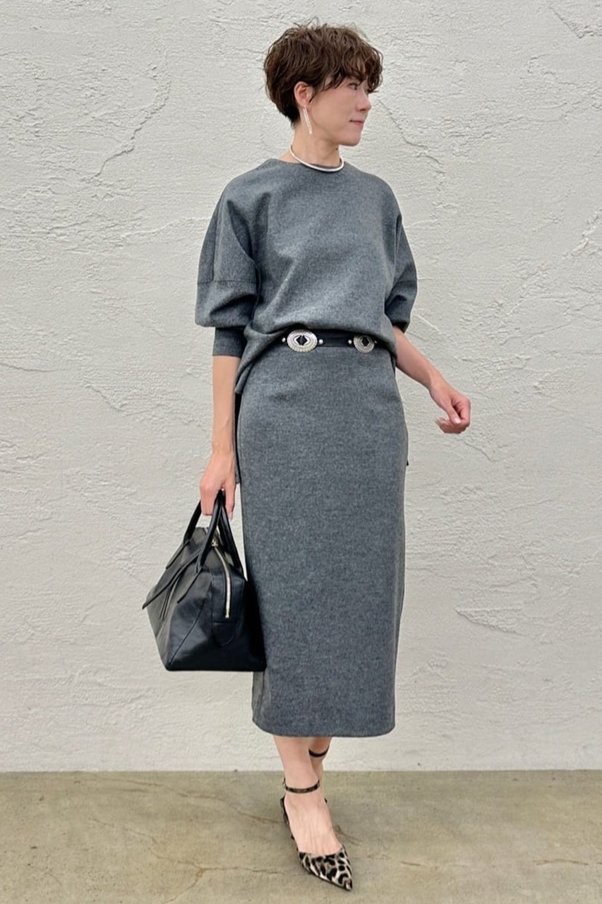 しなやかな圧縮スムース素材を使用したクルーネックプルーバーとタイトスカート