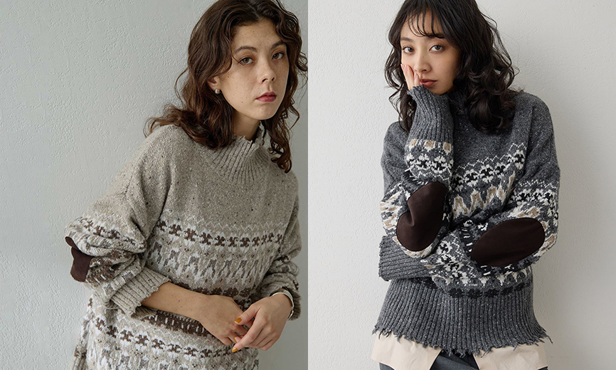 肘のガンパッチやダメージ加工がヴィンテージライクのフェアアイルニット