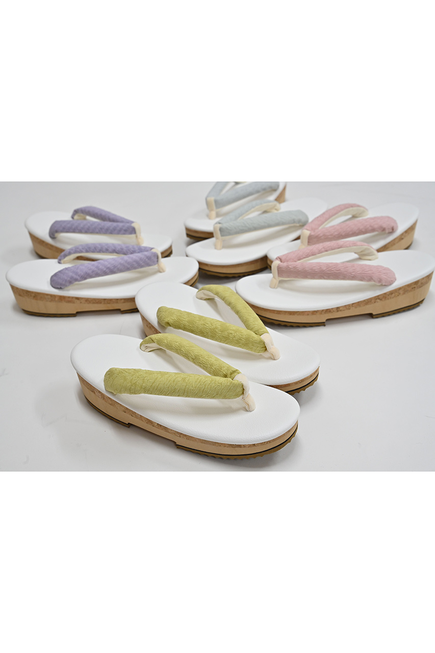 有松絞りの生地を鼻緒に用いた草履。真っ白の天が足を美しく見せます。やや太めの鼻緒で足も痛くなりにくく、超軽量でまるで靴を履いているかのように疲れ知らずで歩きやすい。素足で浴衣はもちろん、足袋を履いてお着物にも合わせやすいですよ。