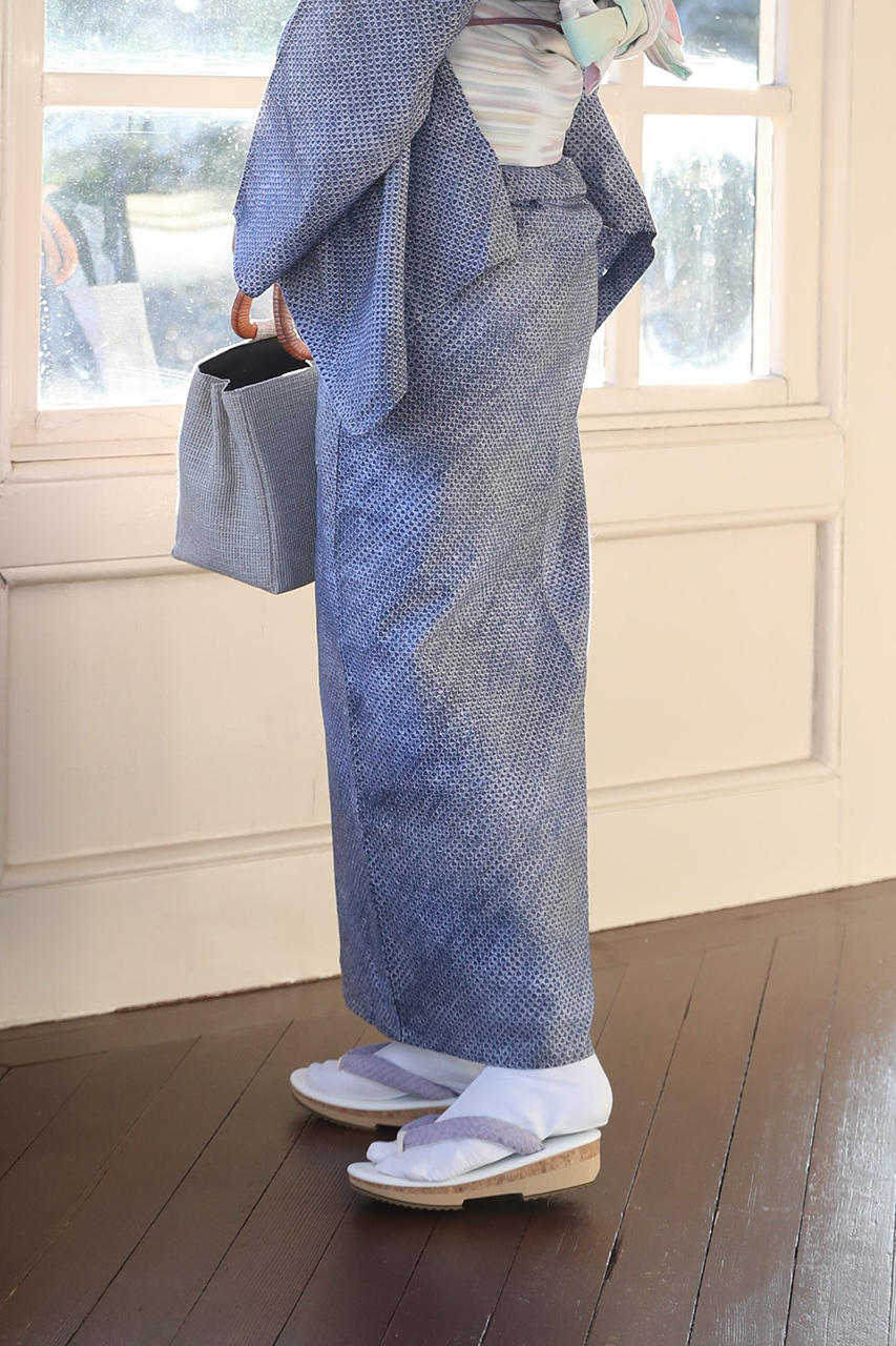 こちらは、先にご紹介した千鳥柄の色違いのベージュ。ひと手間かけた「くも絞り」技法を取り入れたオリジナル雪花絞りの半幅帯を合わせてきりりとした印象に。
