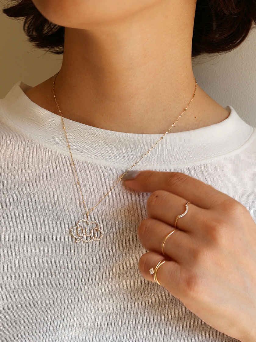 ぱっと目を引く遊び心あるチャームが主役のコーディネート。華奢なチェーンでモチーフを際立たせ、指先も細めのリングを横にレイヤード。耳元はイヤーカフとライン上のダイヤモンドピアスですっきりまとめて。