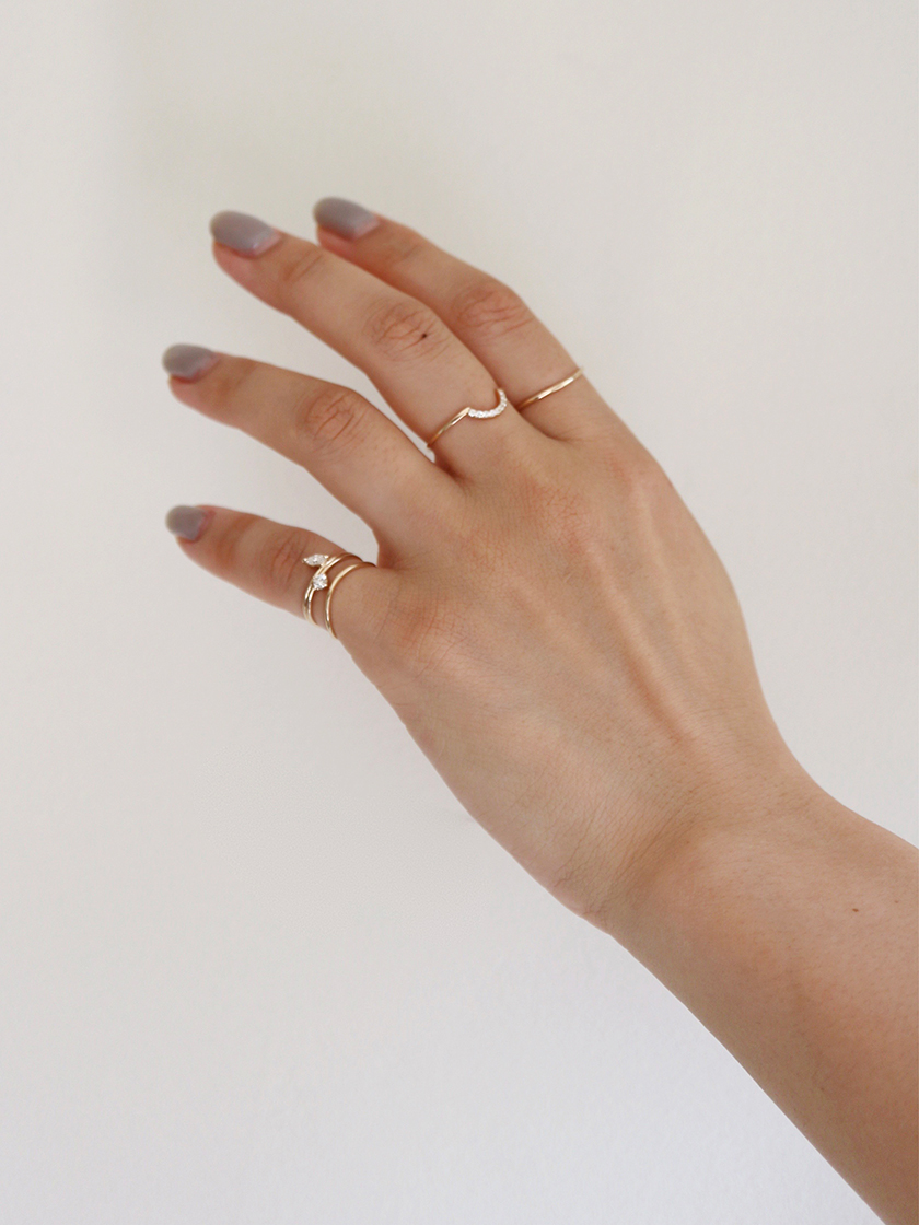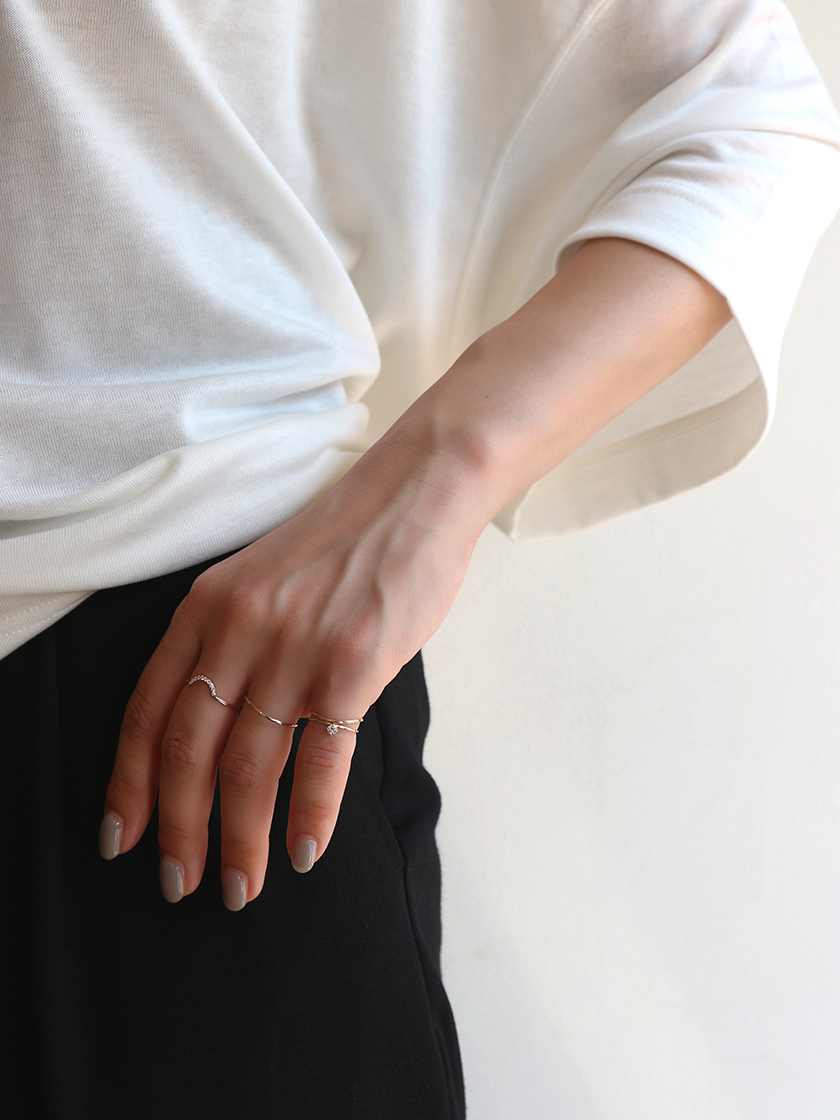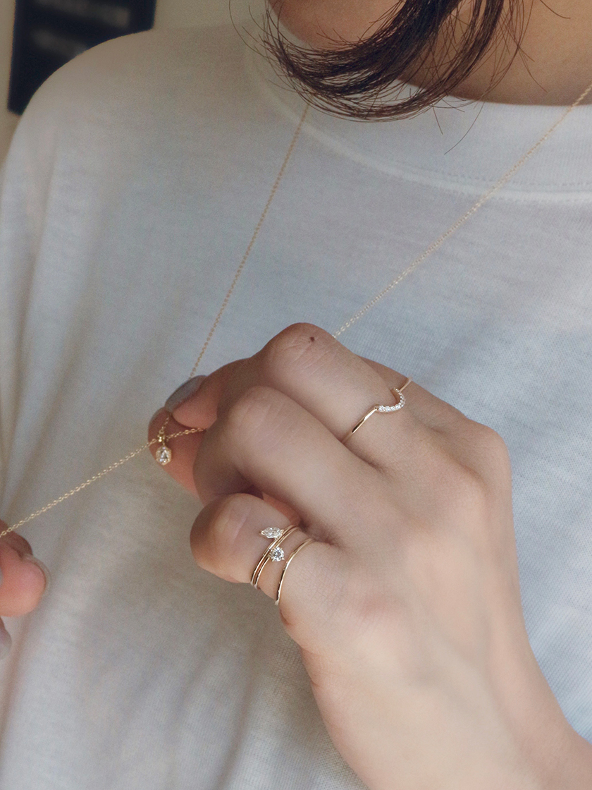 華奢なピンキーリングを3本重ねづけ。カットの異なるダイヤモンドのピンキーリングをあえてずらしてつけることで、石の個性が光ります。緩やかに波打つゴールドリングは抜け感を出しつつ空間を埋めてくれるので、ひとつは持っておきたいアイテムです。