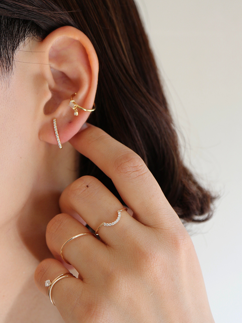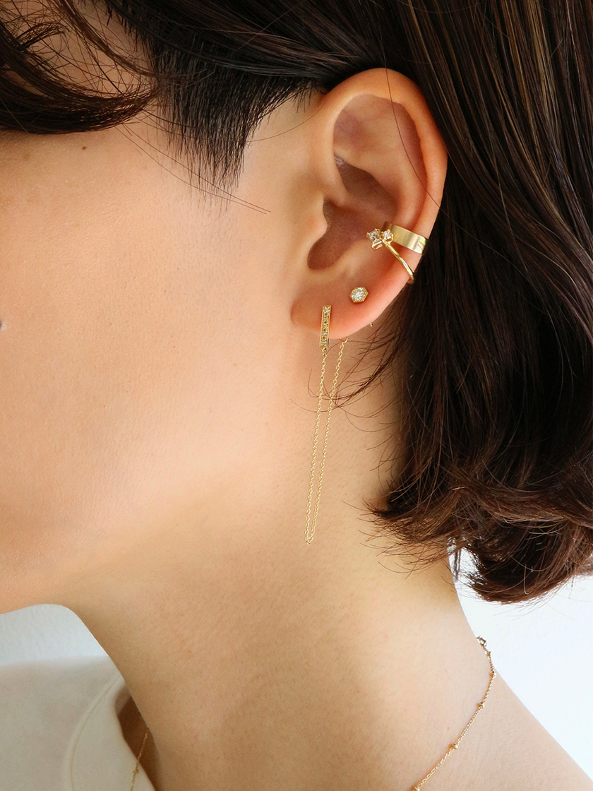 耳元のレイヤードスタイルをご提案。揺れるチェーンのピアスはスタイリングに動きを出せるお役立ちアイテム。中央の六角形の一粒ピアスは、チェーンが付属しているため、コーディネートによってチェーンを足して2WAYで楽しんで。イヤーカフはダイヤ付きとゴールドのフラットタイプを組み合わせても◎。