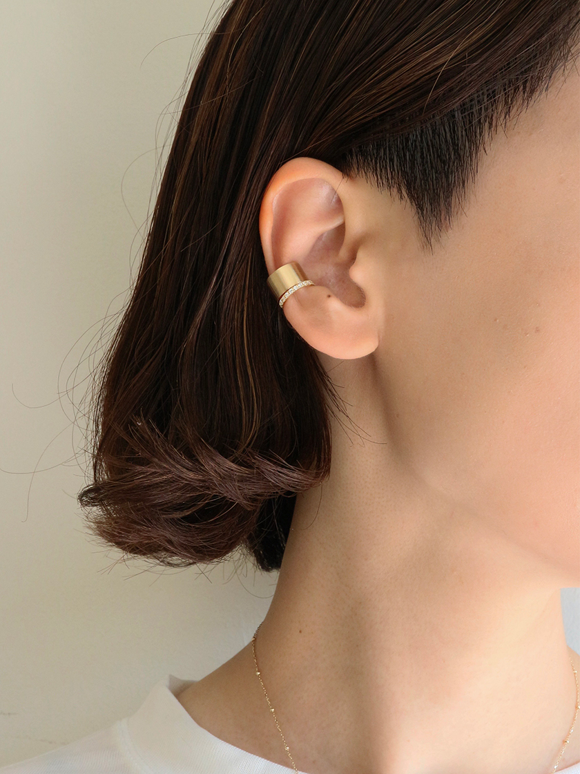 すっきりとしたイヤーカフの重ねづけでスタイリングをワンランクおしゃれに。一つでも存在感のあるエタニティタイプのイヤーカフは、地金のイヤーカフとセットするとこなれた印象に。幅広フラットなイヤーカフは、艶ありと艶消しのハーフ&ハーフになっているので、気分に合わせて付け替えて。