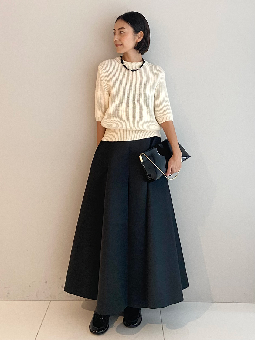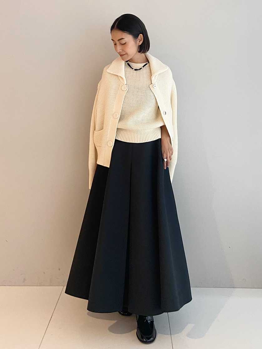 冬のモノトーンスタイルを華やかに見せてくれるオフホワイトのニット&カーディガン。カーディガンはポロカラーとくるみボタンがアクセントになったデザインです。合わせたフレアスカートはたっぷりとしたボリュームとマットサテンの質感が映える一枚、ニットとの素材のコントラストを楽しんで。「camille surault」との別注チョーカーで品の良い艶をプラス。