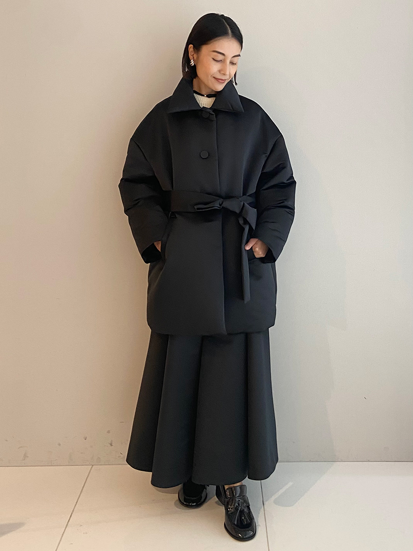 「オブリオ」で人気のダウンコート、ダウンのスポーティーな印象を刷新する上品な光沢感とパフィなフォルムが魅力です!ウエストベルトでフォルムの変化も楽しめます。同素材のフレアスカートとエレガントなダウンスタイルが完成です。
