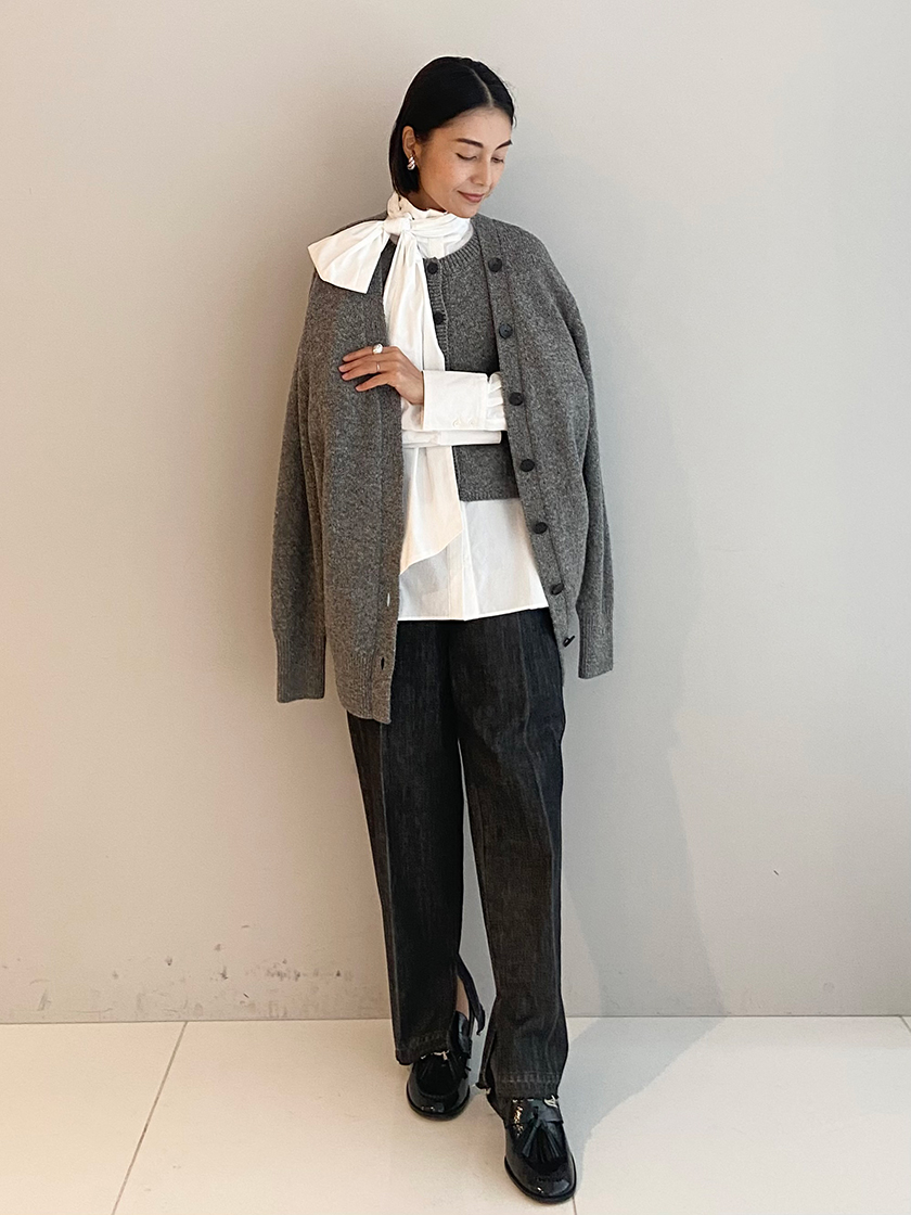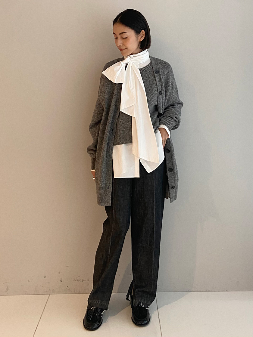前身頃だけ重ね着をしたようなギミックのあるフェイク・レイヤードデザインが面白いカーディガンと、今季トレンドのボウタイブラウスでブラックデニムをエレガントに着こなして。ブラウスのボウタイは巻き方次第でエレガントにもモードにもアレンジを楽しめるので、コーディネートの幅が広がる一枚です。
