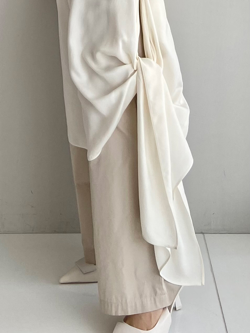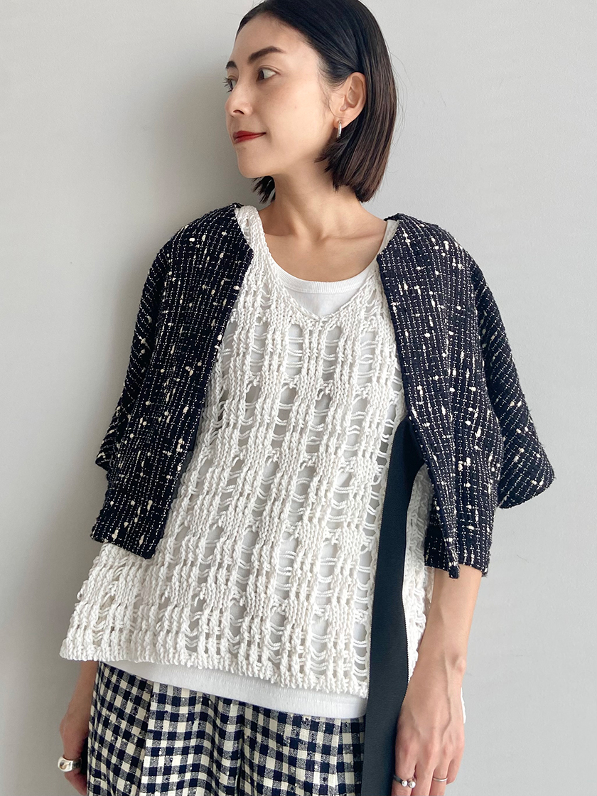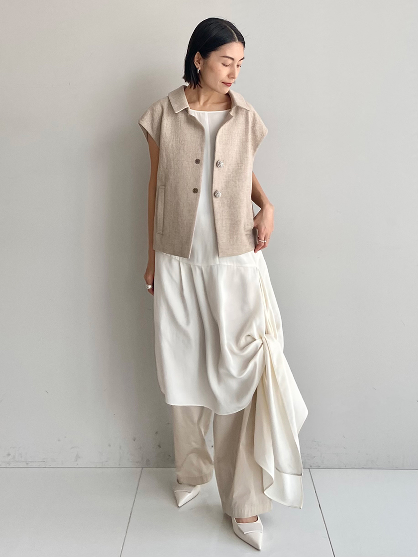 煌めくビジュー・ボタンが印象的なコクーンフォルムのコンパクトジレは他にはない特別感。一枚でもインパクトがありますが、流れるラインが美しいイレギュラーヘムトップスと重ねて、裾は結んでアクセントをプラス。異なるテクスチャーのアイテムをニュートラルカラーで品よく、ほどよくヘルシーな着こなしがお気に入りのコーディネートです!