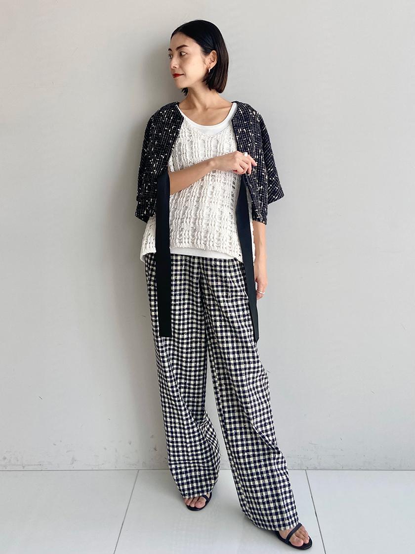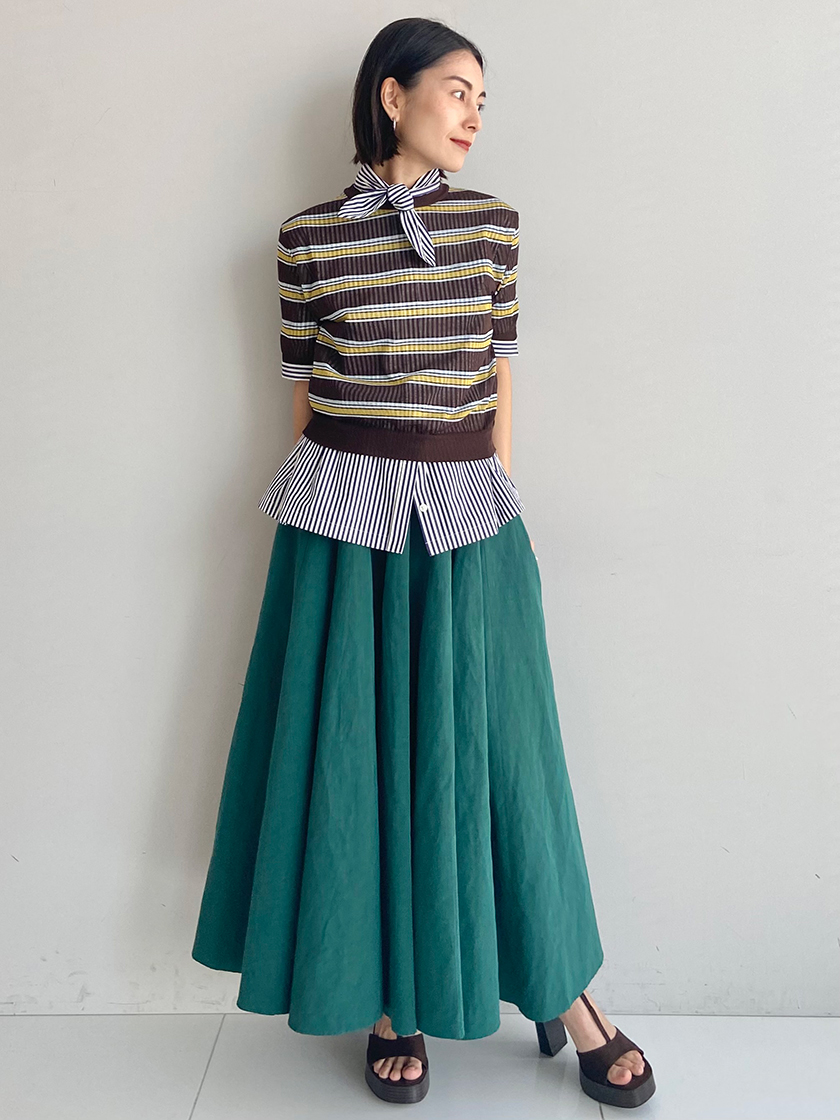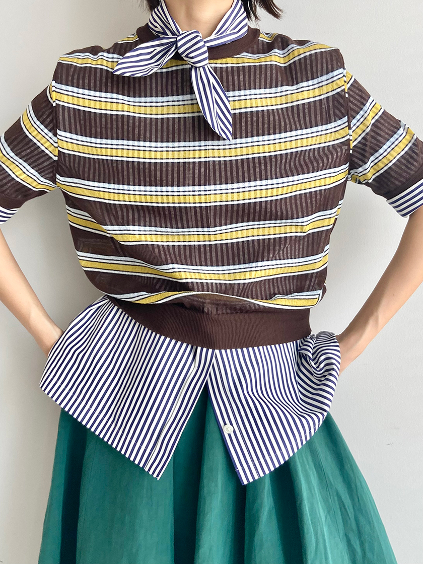 ヴィンテージからイメージしたクルーネックボーダーニットは、70’sムード漂う配色デザインと現代的なトランスペアレントの軽やかさが共存するデザイン。ボウリボンがクラシックなストライプシャツを重ねて、シアー感を活かしたチェック柄風にアレンジ。遊び心ある着こなしが展示会でも人気のルックです!