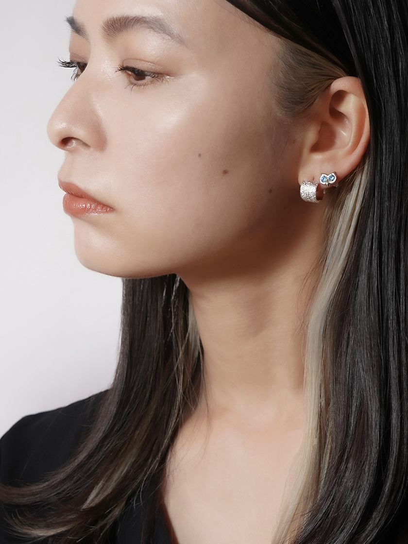 フクロウは世界中の様々な神話に登場し、日本でも古来から縁起のよい動物として親しまれてきたそうです。着けるたびにデザイナーが描いた穏やかな表情にほっこりしてしまいます。今回は特に鮮やかな色のアクアマリンが手に入ったので、気になっている方はお早めに。コーディネートに華やかさをプラスするなら、美しいブルーを生かすシルバージュエリーを。「アヤミ ジュエリー」でも人気のシャイン柄のピアスなどがおすすめです。