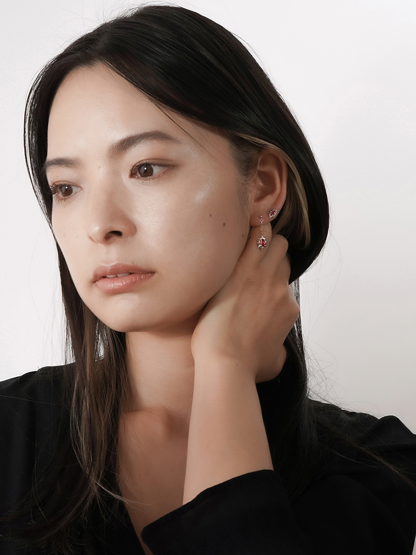 ルビーを留めた「炎」のシルエットのピアス。デザイン画を見た時から「こんなに可愛らしい炎なんて見たことがない!」とその愛らしさの虜に。私はルビーとピンクトルマリンのレイヤードが一番のお気に入り。