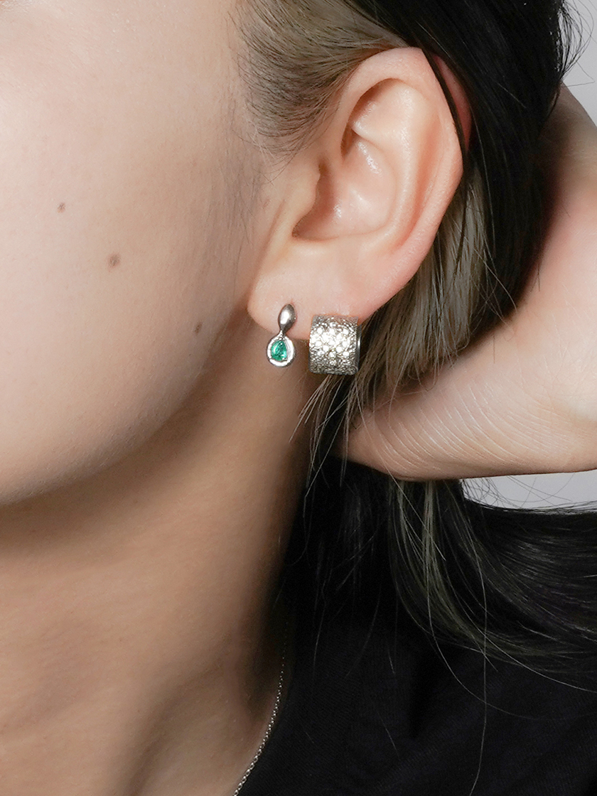 デザイナーも着けているエメラルドのフープピアスは、定番のパヴェフープピアスと合わせればオケージョンにも。エメラルドはヒーリング効果の高い石とも言われており、忙しい時期のパートナージュエリーとしても活躍しそう。小さくても発色の良いグリーンなので、モノクロやワントーンなどのシックなコーディネートのアクセントとして着けたいです。