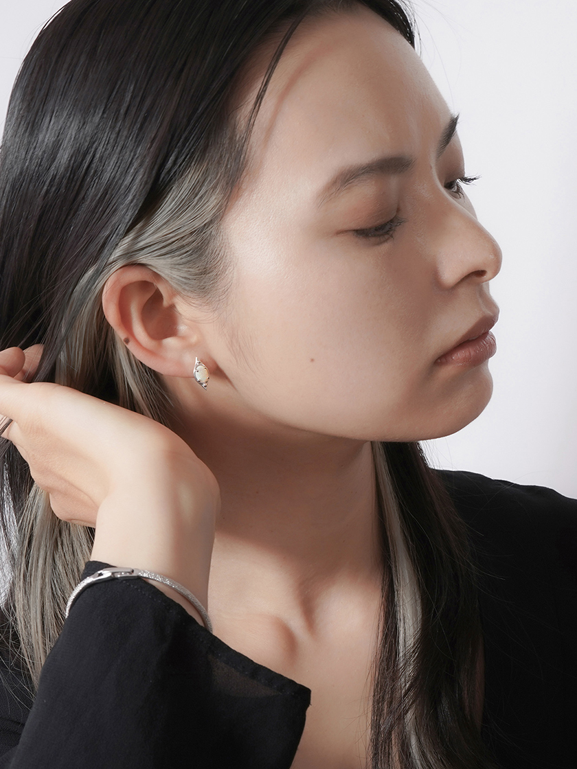角度によって変化する虹色のプリズム。そのオパールの最大の魅力を生かしたシンプルな着け方がおすすめ。耳元はオパールのピアスのみで、ネックレスレスか、控えめなデザインをチョイスして。バングルやブレスレットを合わせるとエレガントでありながら、こなれた印象に。