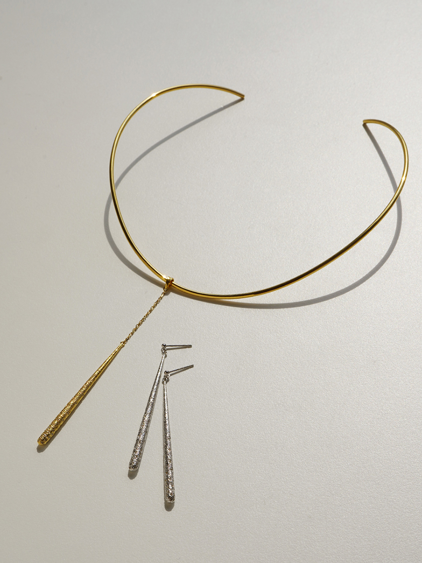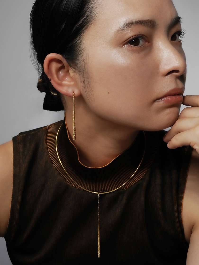今季注目のチョーカーは、トップのチャームを付けるとY字ペンダント風に、外せばシンプルなチョーカーに変身する2WAY仕様が魅力。「アヤミジュエリー」のチョーカーは、置いたときにも緩やかに曲線を描き、このカーブが首から肩のラインに美しくフィットするよう、職人が丁寧に調整しています。フィット感が格別なので、ぜひお試しください。