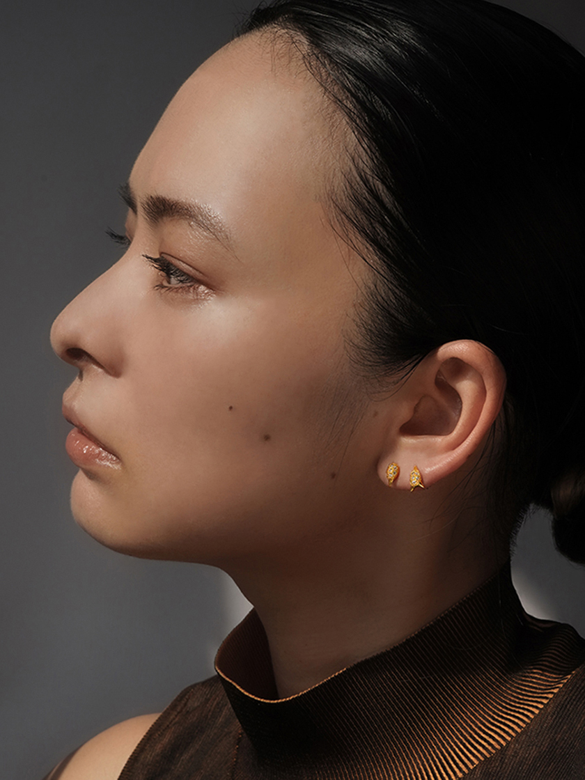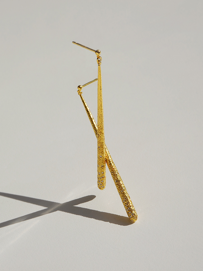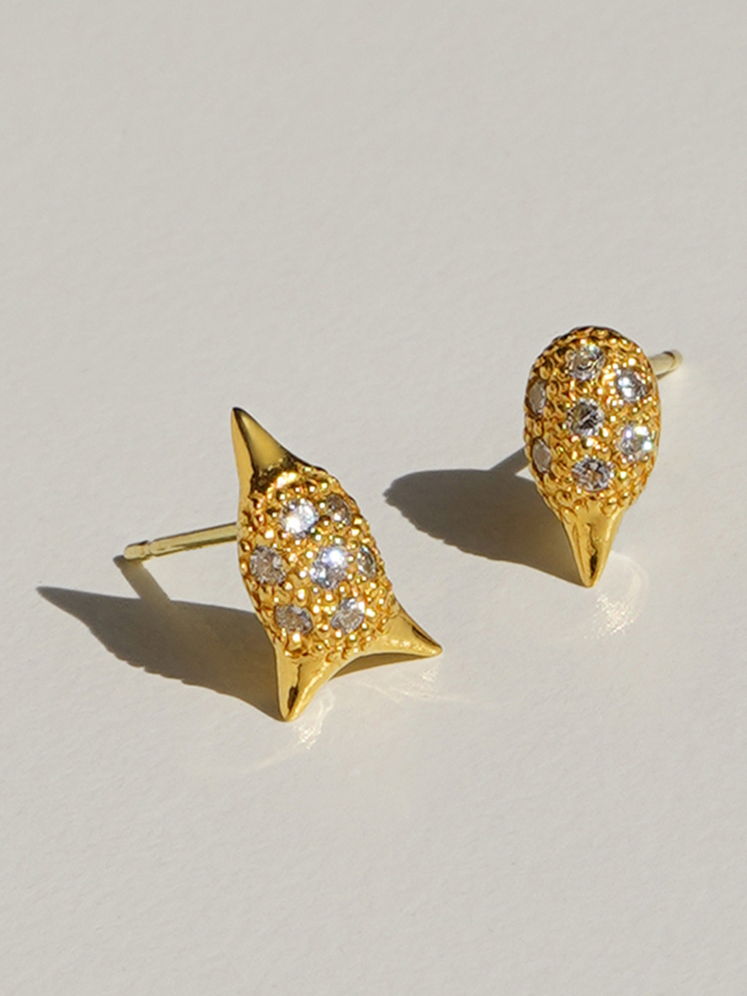 パヴェボールから小さなとげが生えた「Thorn(とげ)」ピアス。繊細な石留めと玉作りのリッチな存在感をあえて崩すミスマッチなデザインが特徴です。左右異なるデザインで、今季のトレンドであるアシンメトリースタイルにもぴったり。私は左に2つ着けて楽しみたいと思います。