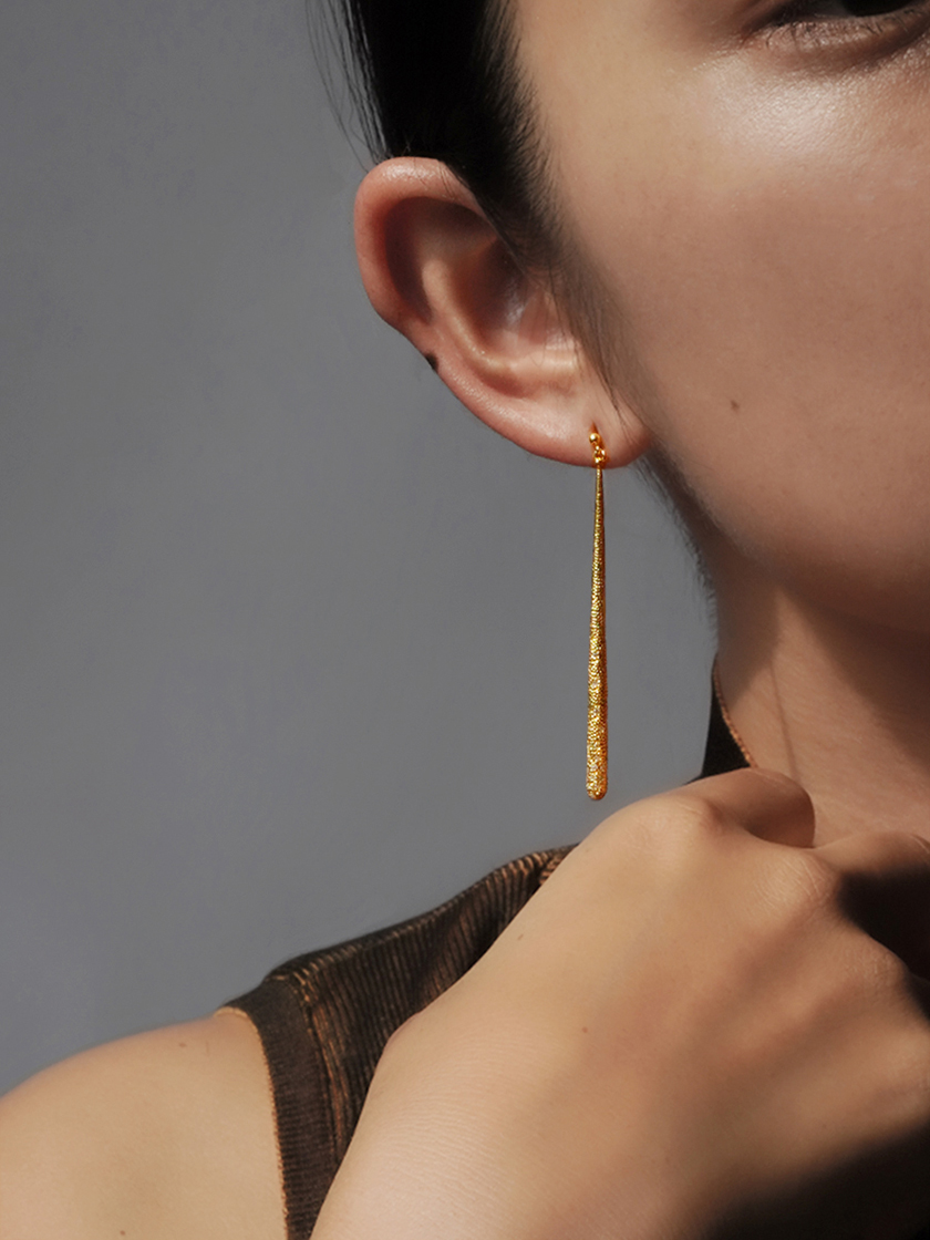 耳元で映えるロングドロップピアス。シンプルでありながら、長めのサイズが個性を引き立てます。玉作りのテクスチャーがリュクスな雰囲気を醸し、ランダムに留められた石がさりげなく輝きます。大ぶりなデザインで小顔効果が期待でき、縦長フォルムは顔周りをすっきり見せるため、シンプルなスタイルに一点投入がおすすめです。