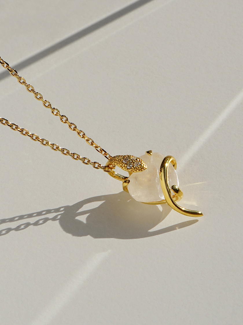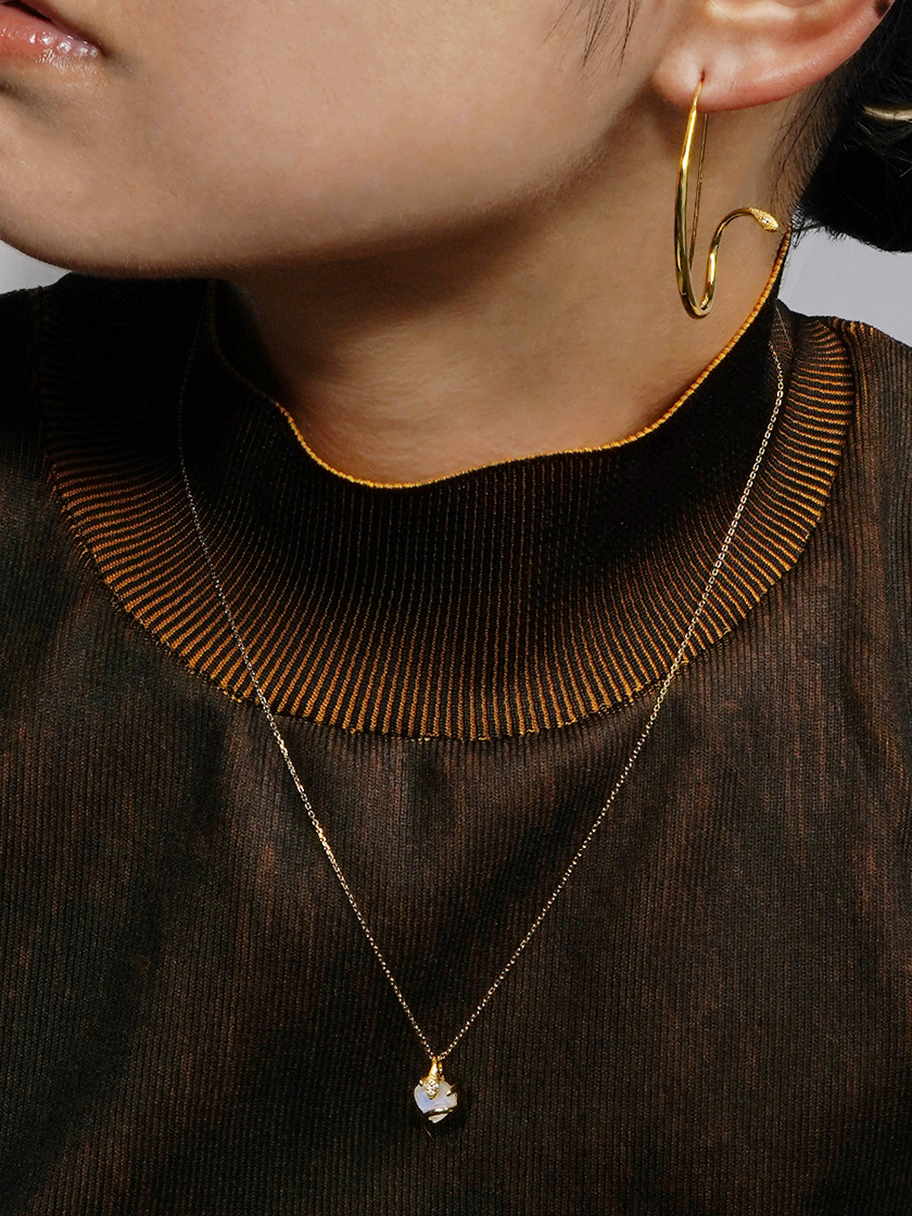 「再生」の象徴とされる蛇をモチーフにした「ルネ」シリーズの新作をご紹介。ハートシェイプのラブラドライトを抱える蛇のペンダントと、フープピアスでコーディネート。ラブラドライトは潜在能力を引き出し、直感力を高めるとされ、角度によって色が変わる神秘的な虹彩が特徴。シンプルなスタイルに奥行きを加えるアイテムです。大人の気持ちに寄り添う、特別なハートモチーフを楽しんでください。