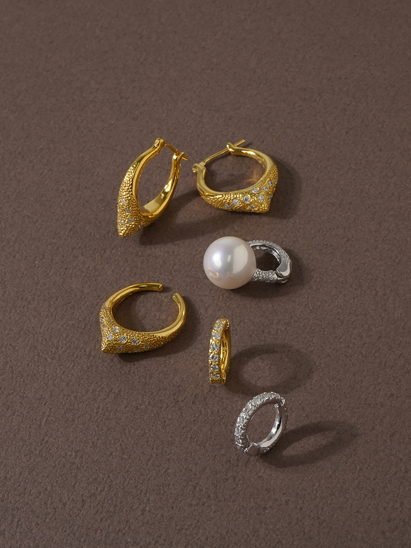 パールや石のホワイトと地金のバイカラーも、手軽に取り入れやすい選択肢です。メタリック同士よりも柔らかなコントラストが生まれ、初めて挑戦する方にもぴったり。ミニマムなサイズ感が叶えるリュクスな雰囲気と、エッジの効いたデザインの絶妙なバランスが、おしゃれ心をくすぐります。