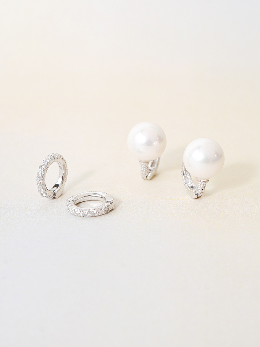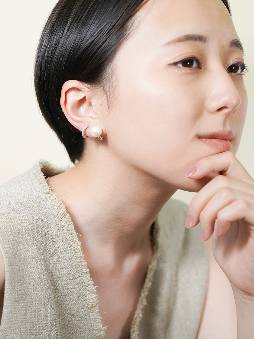 ブランドデビュー以来人気のパヴェのフープイヤリングは、凛とした魅力を引き立ててくれるパールのニュアンスカラーと合わせて。