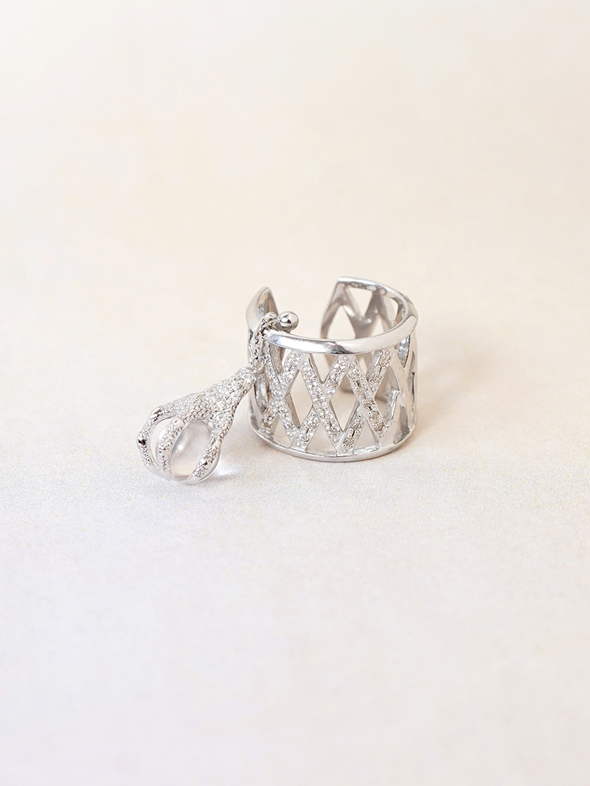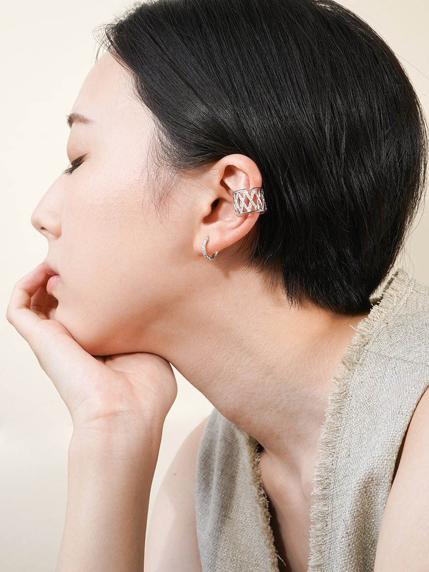 存在感がありながら、透かし柄で軽やかな印象のメッシュイヤーカフ。繊細な線の上にびっしりと敷き詰められた石がリュクスな輝きを放つ、大人のジュエリーです。