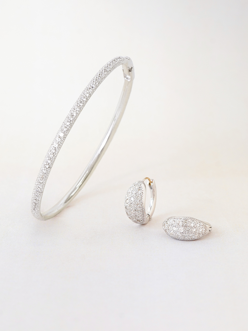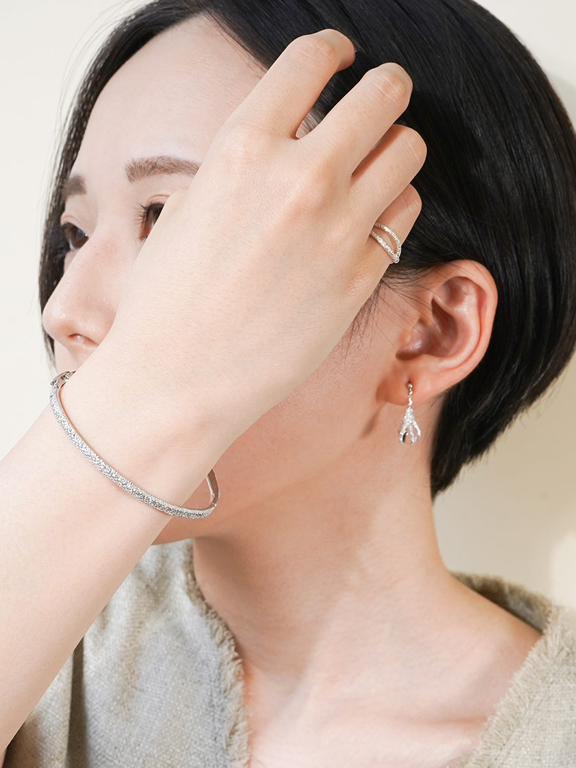 シンプルなバングルとパヴェのリッチな輝きを楽しめるイヤリング。なんとなく調子のでない朝でもこれさえ身に着ければ自信をもって出かけられる、私の鉄板コーデです。