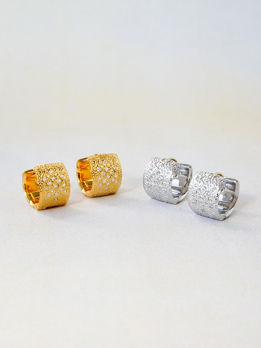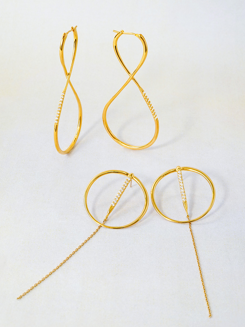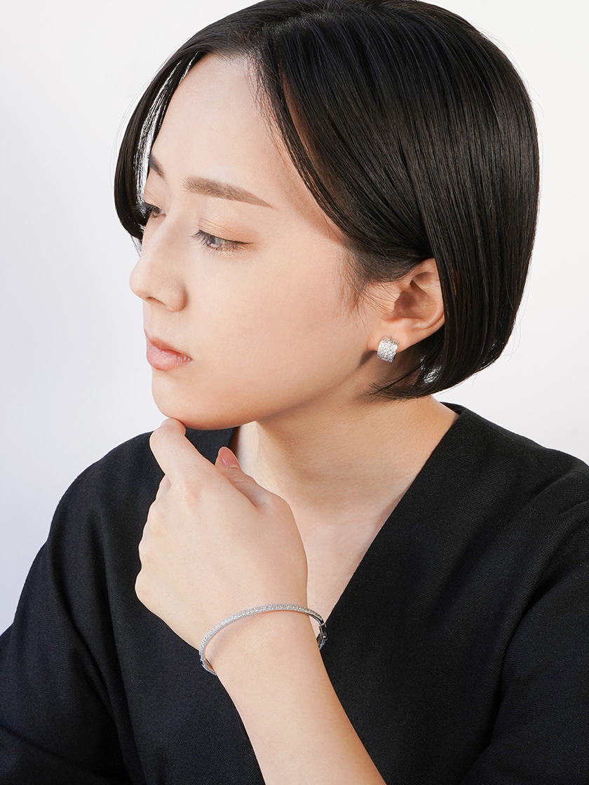 宝飾品と一緒につけられるほど精緻なつくりにこだわったジュエリーは、無駄なデザインをそぎ落としたシンプルさが、その人の知的な魅力を引き出してくれます。特に、サークルモチーフのピアスとバングルは、縁を運んでくれるアイテム。新しい年に新たな出会いに恵まれますように、という想いが込められています。