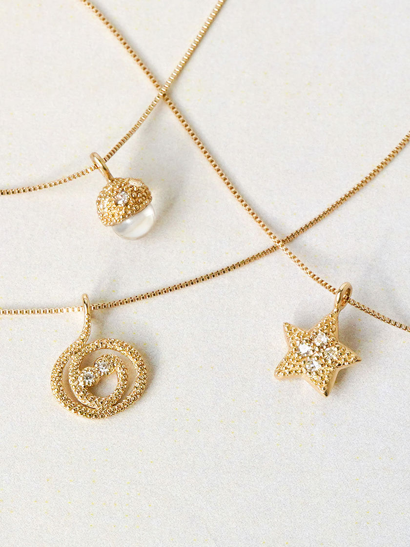 真円の水晶を穴を開けることなくやさしく包み込んだクリスタルのペンダント。水晶には精神、身体の調和、バランスを取ってくれるヒーリング効果があるともいわれています。私は光にかざして眺めて、元気をもらっています。豊穣と天候を司ると言われている蛇のペンダント。愛らしく表情豊かにデザインされたアイテムでさりげなくパワーチャージしています。平和を表す星のモチーフは、夜空を見上げて癒されるように、心に平穏をもたらしてくれます。
