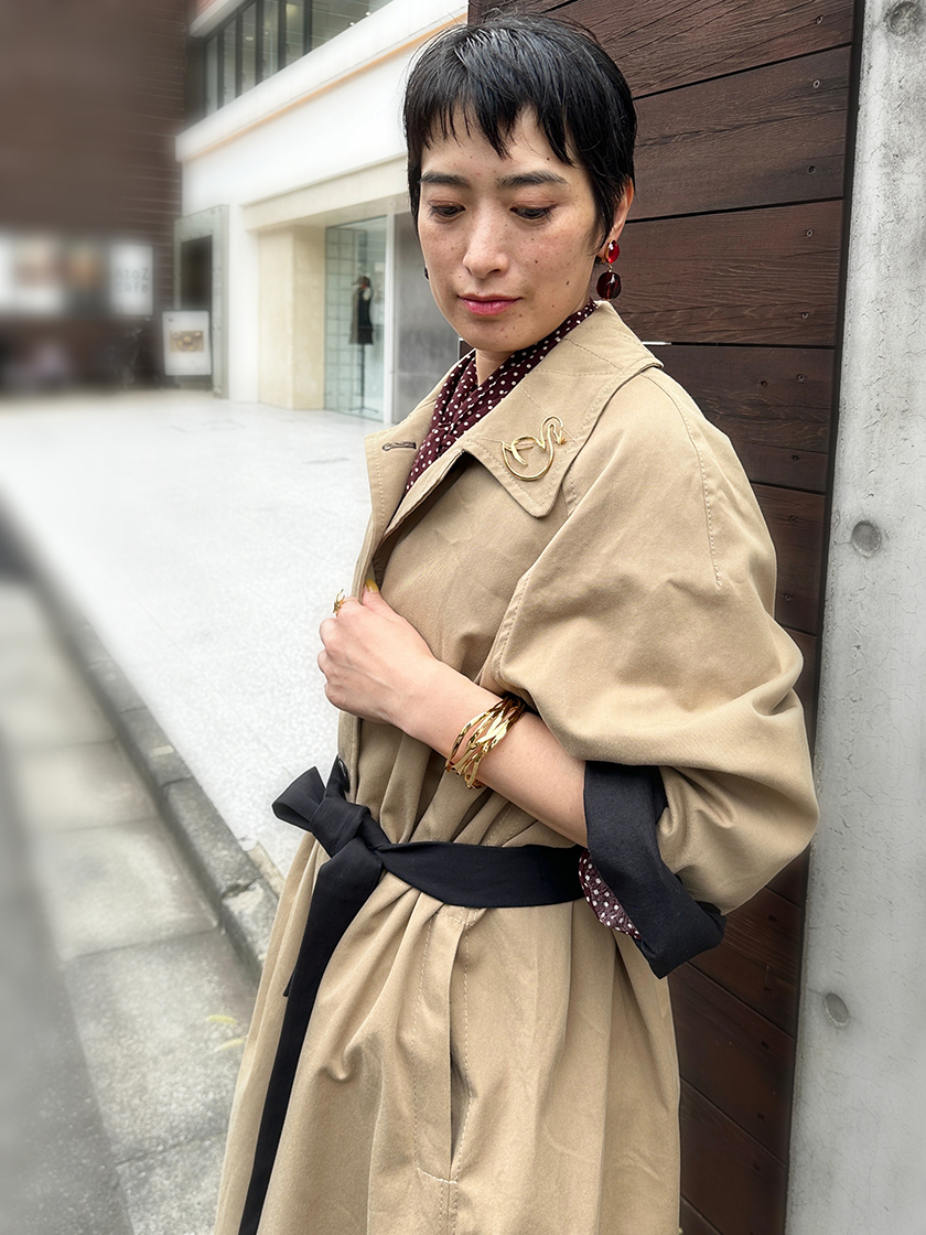 ブローチのアレンジを3点。大きなモチーフのブローチは、気軽にトレンチコートの襟やミニスカーフ、ニットに着けるだけで普段のコーディネートをアップデートできるので、この秋冬とってもおすすめ。ぜひトライしてみてください。