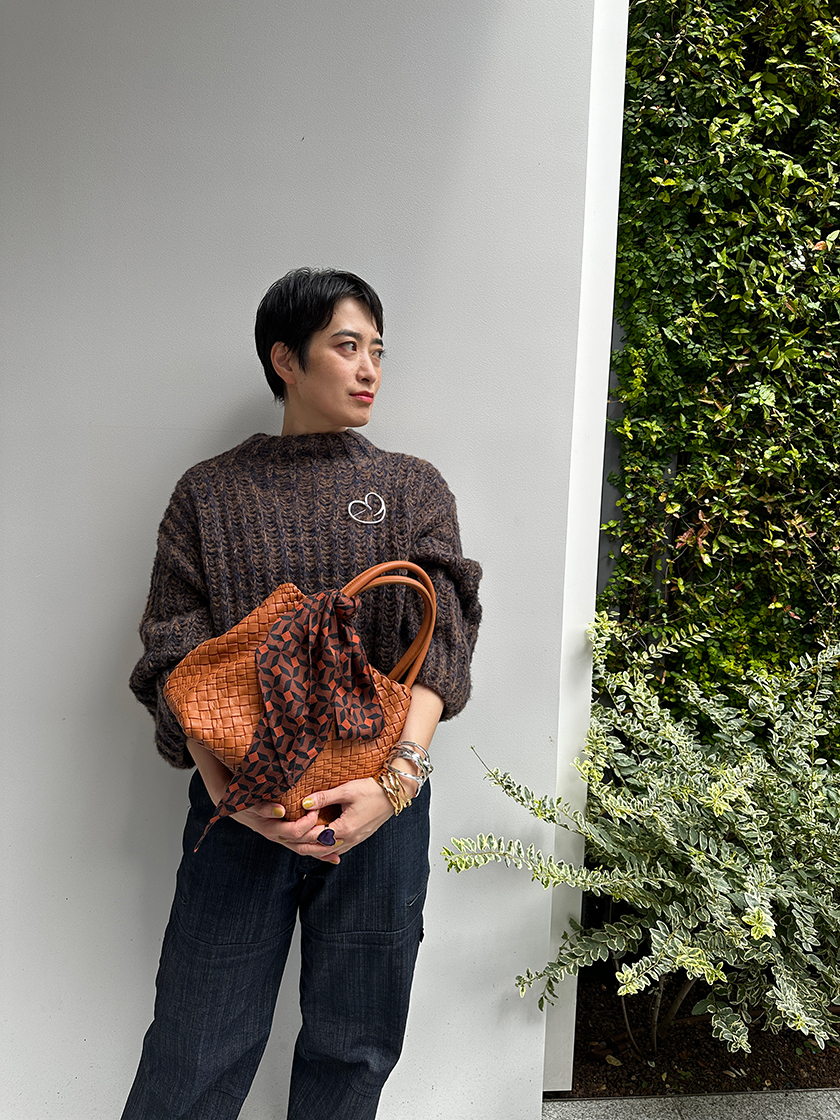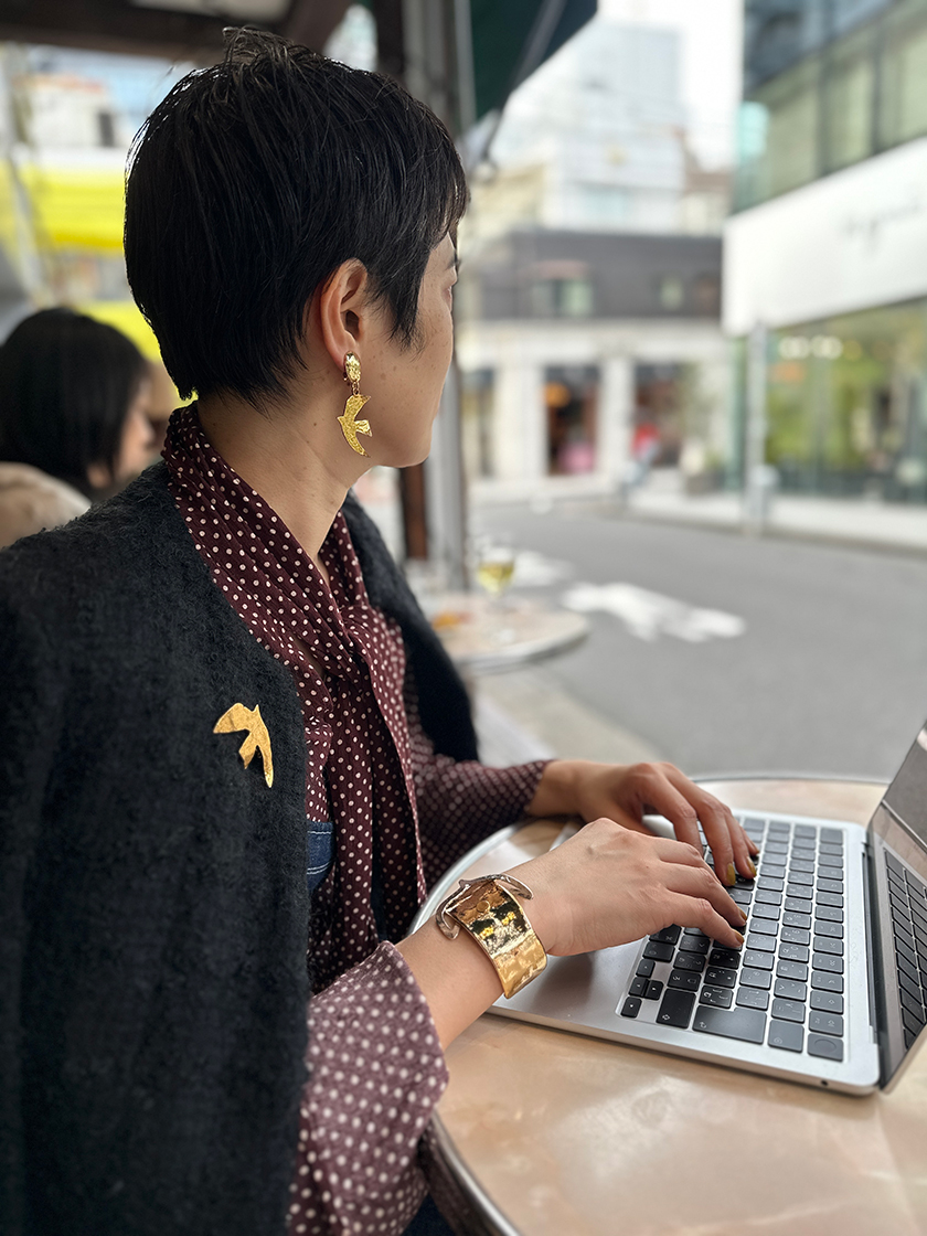 シックでダークトーンのコーディネートには、ゴールドのラ・コロンブ(鳩)ブローチで明るさをプラス。モチーフを重ねても自然となじむのは、手作りならではの落ち着いた光沢感が絶妙なバランスを奏でるからこそ。