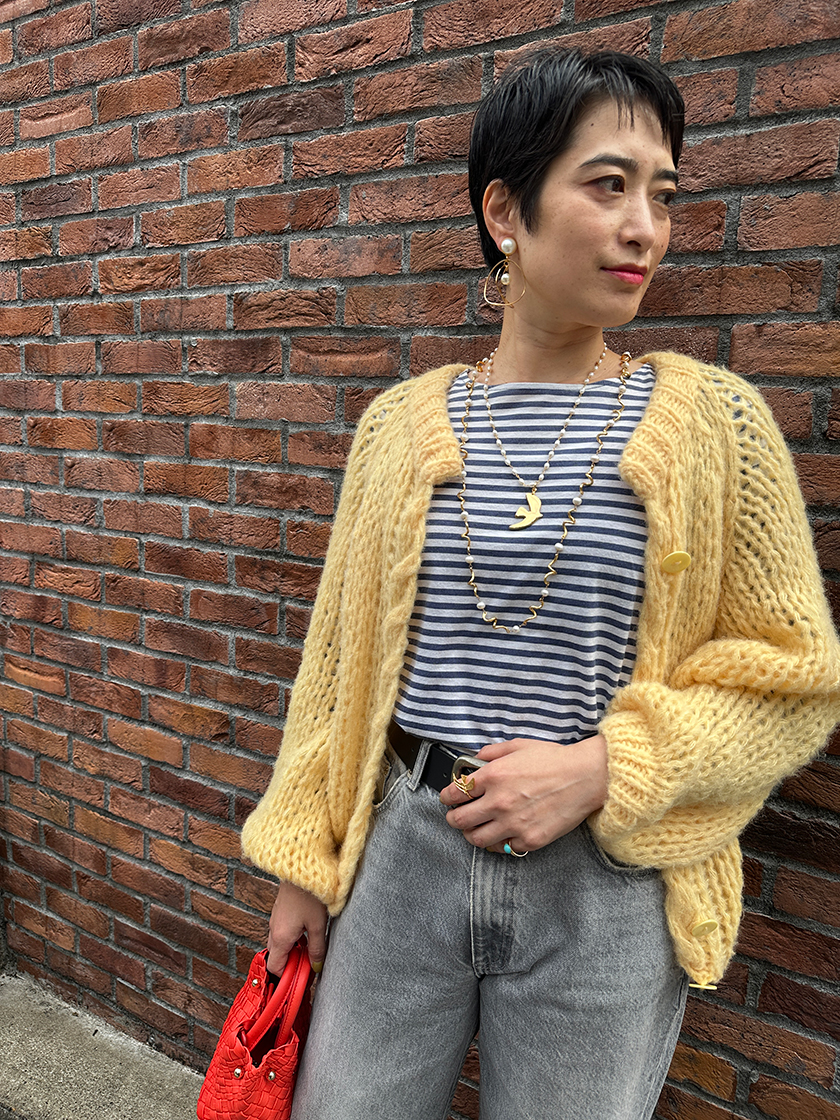 ゴールドとパールを組み合わせた贅沢なネックレスは、パーティだけではもったいない。フレンチなボーダーに合わせてカジュアルダウンし、デイリーにも活躍。