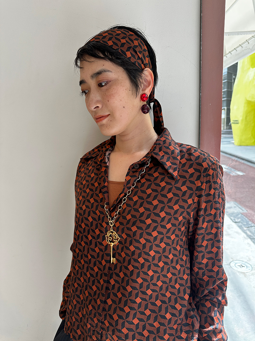 インパクトのあるキーモチーフのチェーンネックレスは、大のお気に入り。柄物トップスと合わせると程よく調和します。全体のカラーリングに合わせた鮮やかなカラーイヤリングも添えて。