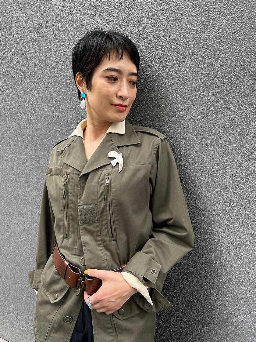 「セシル・エ・ジャンヌ」のアイコン的存在、ラ・コロンブ(鳩)ブローチは、トレンドのハードめなジャケットにも映えます。耳元と手元にクリアなアイテムをプラスし、軽やかで清潔感のある雰囲気に。