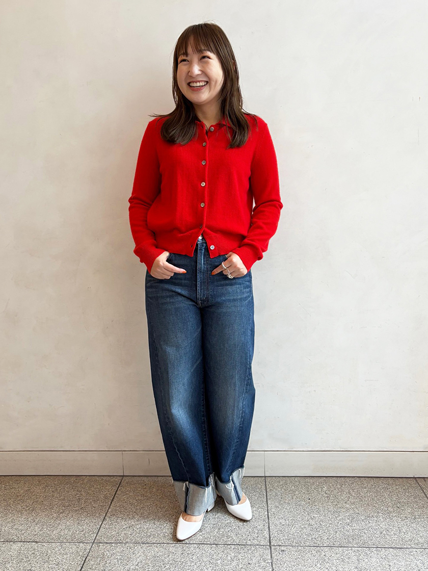 10月からワードローブのスタメン入りしているリブカーディガン。きれいめスタイルになじむフィットシルエットでも、カシミヤ100%の柔らかさと軽やかさで肌触りは抜群。デイリーからオフィスまで幅広く活躍する一枚です。