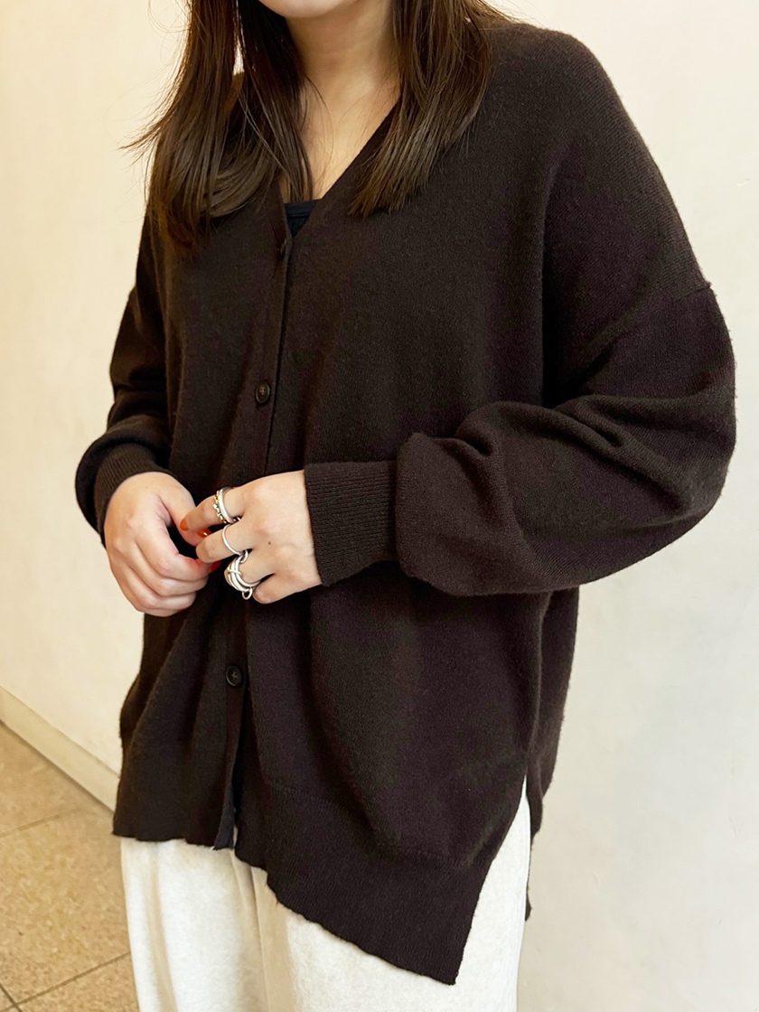 最後は買い足しを迷っている、Vネックのゆったりカーディガン。サイドの深スリットがデザインポイントで着心地も超快適。深みのあるブラウンがカジュアルな装いを落ち着いた雰囲気に整えてくれます。