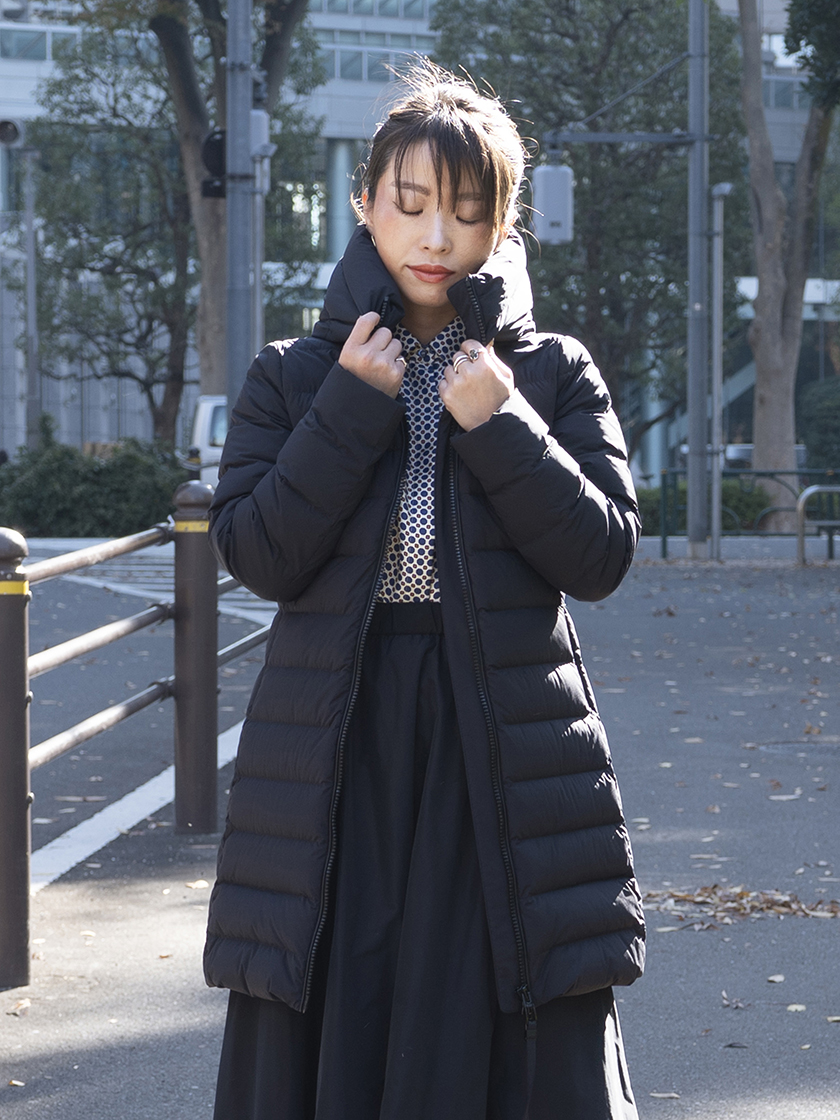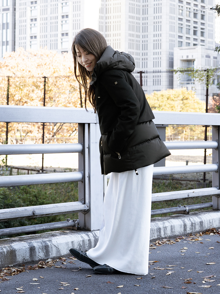 ブラックを主役にすると、同じデザインでもぐっとラグジュアリーな表情に。ストレートのスカートを合わせれば、ボリューム×細身のメリハリが効いて、シンプルながらもスタイリッシュに見えます。ウール部分も、撥水性があるので、雨の日でも安心しておしゃれを楽しめます。